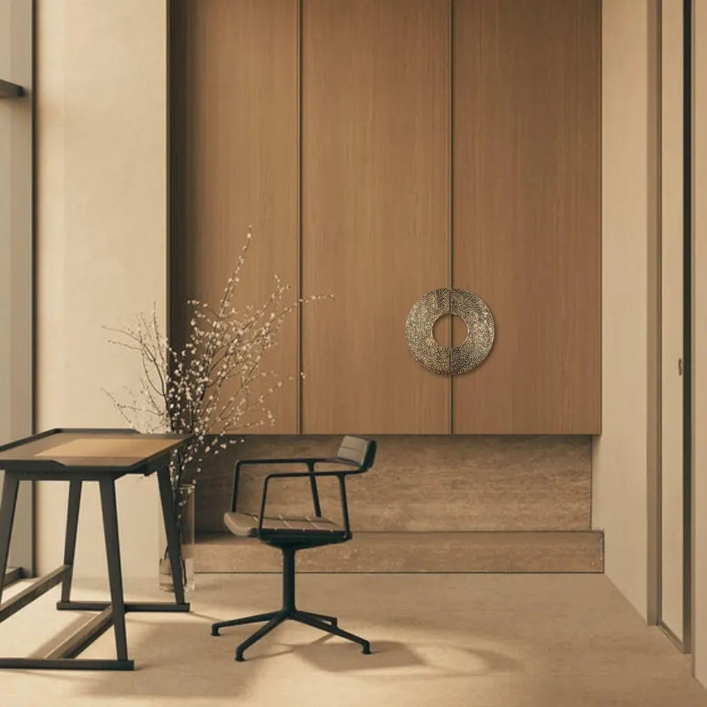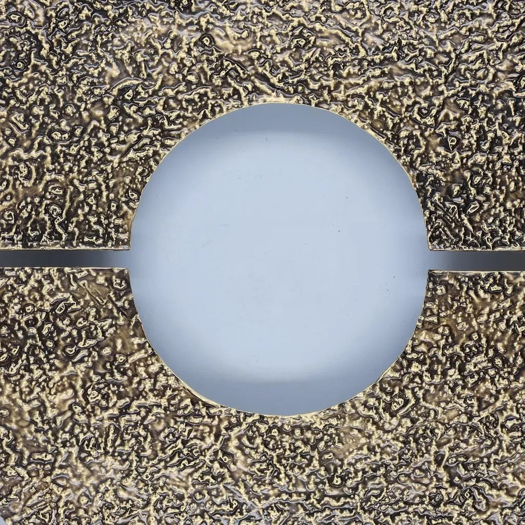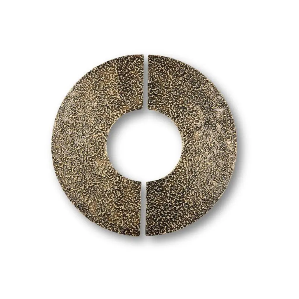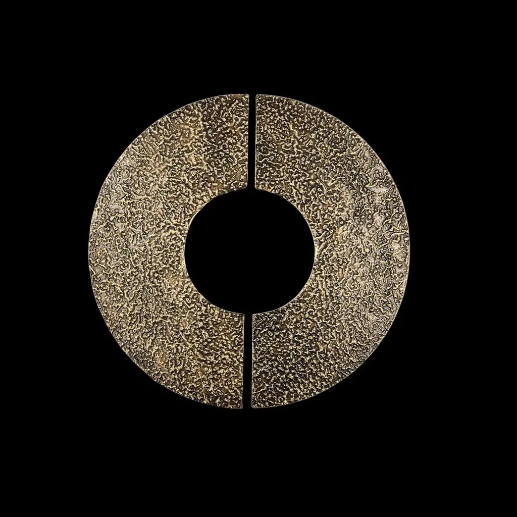 Use: Indoorbrass pull handle with a 30 cm diameter, part of the Earth Prints collection. Crafted using the Hammered and stippled brass technique, it features a textured surface created through hammering, highlighting the natural variations of the material. The antique gold finish plays with the light, revealing a subtle contrast between hollows and reliefs.Its circular design is distinguished by a central opening and a precise cut, dividing the piece into two semi-circular elements. This refined shape maintains the continuity of the circle while introducing a structured geometry, creating a subtle aesthetic that blends seamlessly into both modern and classic interiors.Entirely handcrafted, each piece showcases exceptional artisanal expertise. Designed for indoor use, this pull handle is available with surface mounting, ensuring a stable and durable installation. A meticulous brasswork that enhances the material and texture in a contemporary interpretation.note: Differences from the sample/photo provided should not be considered manufacturing defects, but rather a characteristic of the manual process, which may result in variations in color and uniformity.Brass is a living material that gradually develops a patina over the years.