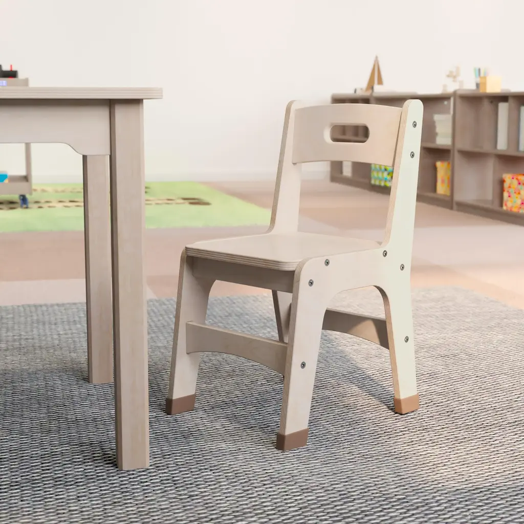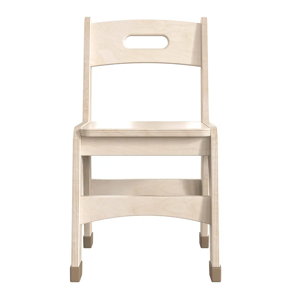Give your preschoolers a comfortable place to sit that promotes good posture and productivity with this set of 2 wooden classroom chairs. These chairs feature a seat height ideal for little ones and boast rounded edges to prevent injury if bumped and silicone foot caps to keep them in place when children are sitting or standing. The natural finish blends seamlessly in any classroom decor while the reinforced seat along with front and back leg braces give additional strength, plus angled legs help prevent tipping. The wood in these chairs is Greenguard Certified for low emission of volatile organic compounds for healthier indoor environments and hold up to 200 lbs. static weight capacity per chair. Regularly wipe clean with a damp cloth and dry to maintain the appearance of your classroom seating. Available in 3 sizes, these chairs match the other items in our early education classroom collection for a cohesive look in your classroom.