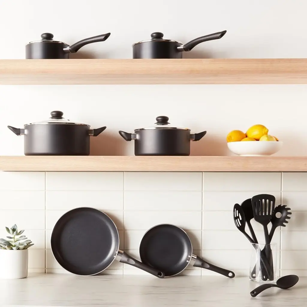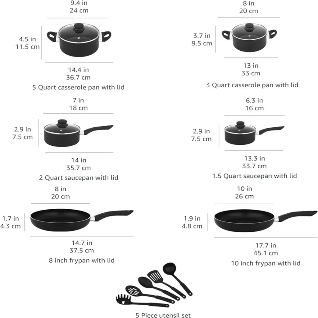 BRINJOY 11-Piece Nonstick Cookware Set offers exceptional cooking performance with its advanced nonstick coating and comfortable soft-touch handles. This comprehensive set includes versatile pieces: 8-inch and 10-inch fry pans, 1.5-quart and 2-quart saucepans with lids, 3-quart and 5-quart casserole pans with lids, plus a 5-piece utensil set. The spiral bottom design ensures uniform heat distribution across all cooktops (except induction), making cooking effortless and enjoyable. Designed for everyday use, the stay-cool handles provide comfort during extended cooking sessions while the premium nonstick surface allows food to release easily. Though designed for handwashing only, this set's durable construction and practical design make it perfect for home cooks seeking reliable performance and convenience in their kitchenware. Product Selling Points Advanced Nonstick Coating Technology Features premium nonstick coating that ensures food slides off effortlessly without sticking, making cooking and cleaning significantly easier. Stay-Cool Soft-Touch Handles Designed with ergonomic handles that remain cool during cooking, providing comfortable grip and safety during extended cooking sessions. Spiral Bottom Heat Distribution Engineered with spiral bottom technology that provides uniform heat distribution across gas, electric, and ceramic cooktops for consistent cooking results. Complete 11-Piece Kitchen Set Includes 2 fry pans, 2 saucepans, 2 casserole pans (all with lids), plus 5-piece utensil set with pasta server, soup ladle, slotted turner, and serving spoons. Handwash-Only Durable Construction Though requiring handwashing, the set features durable construction that maintains its nonstick performance and appearance with proper care.