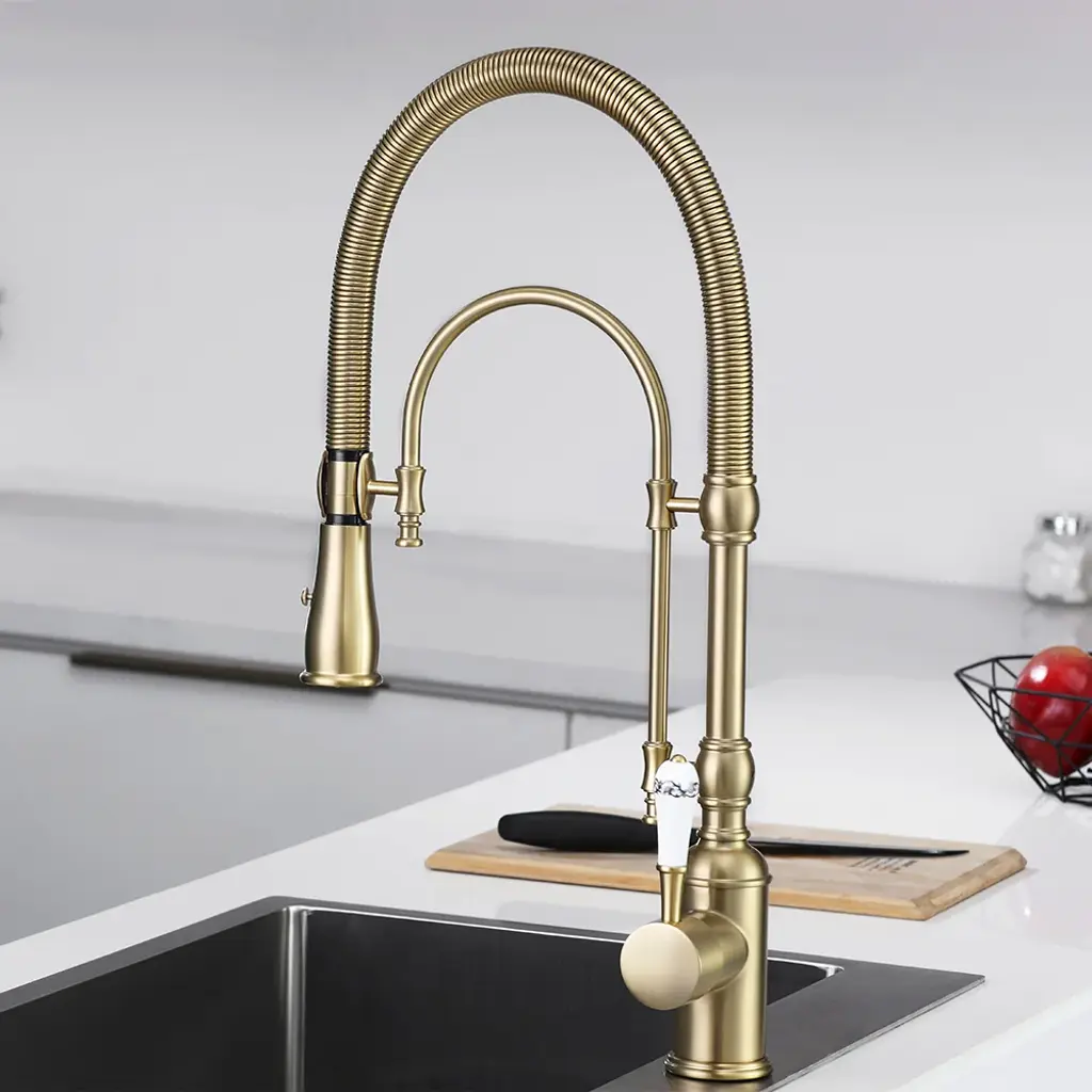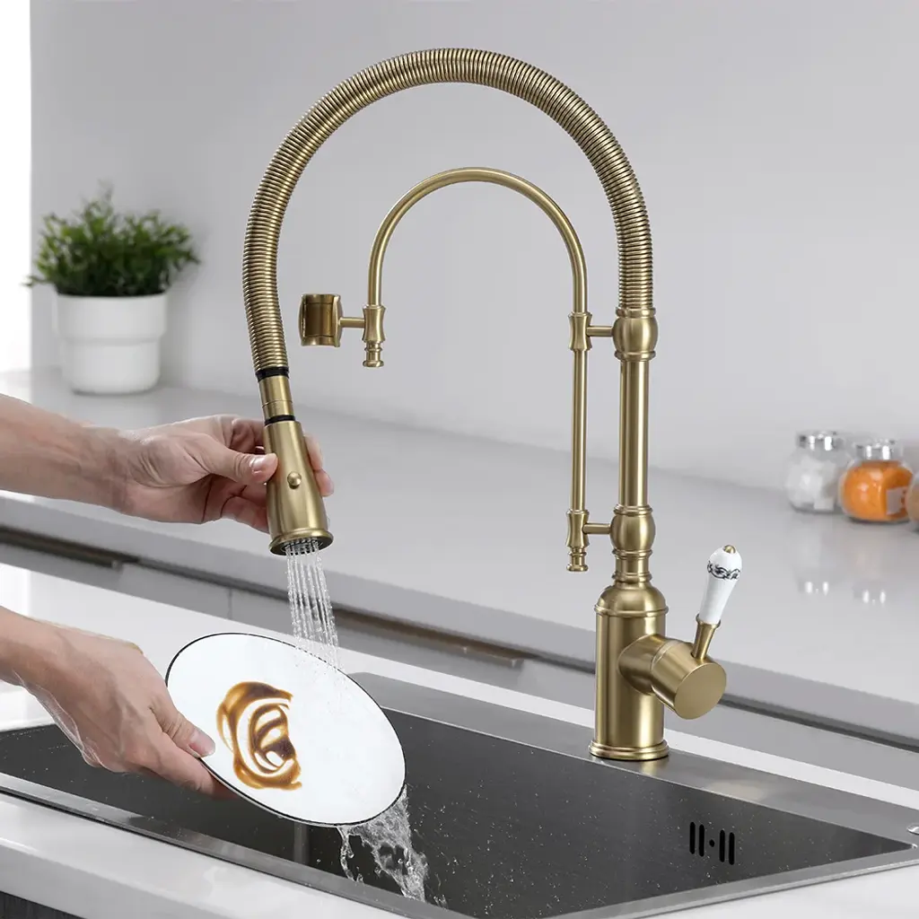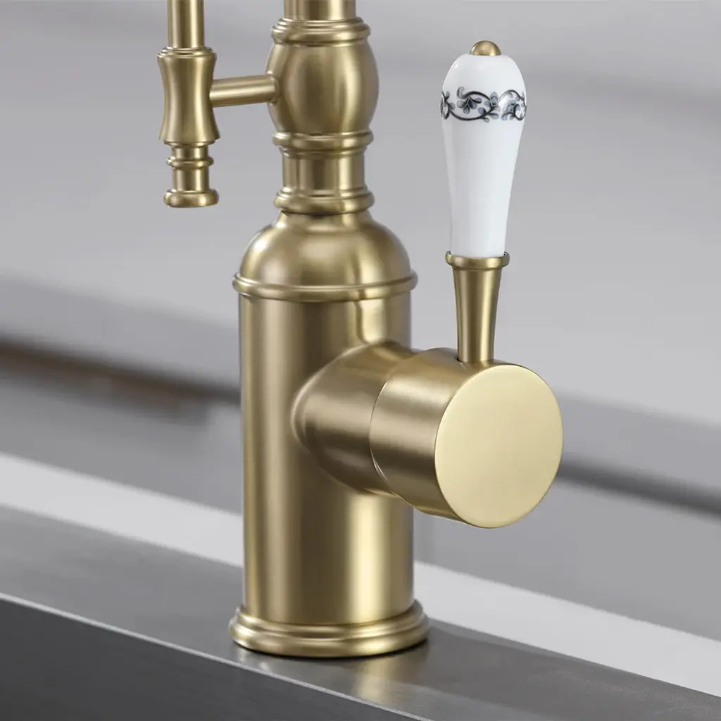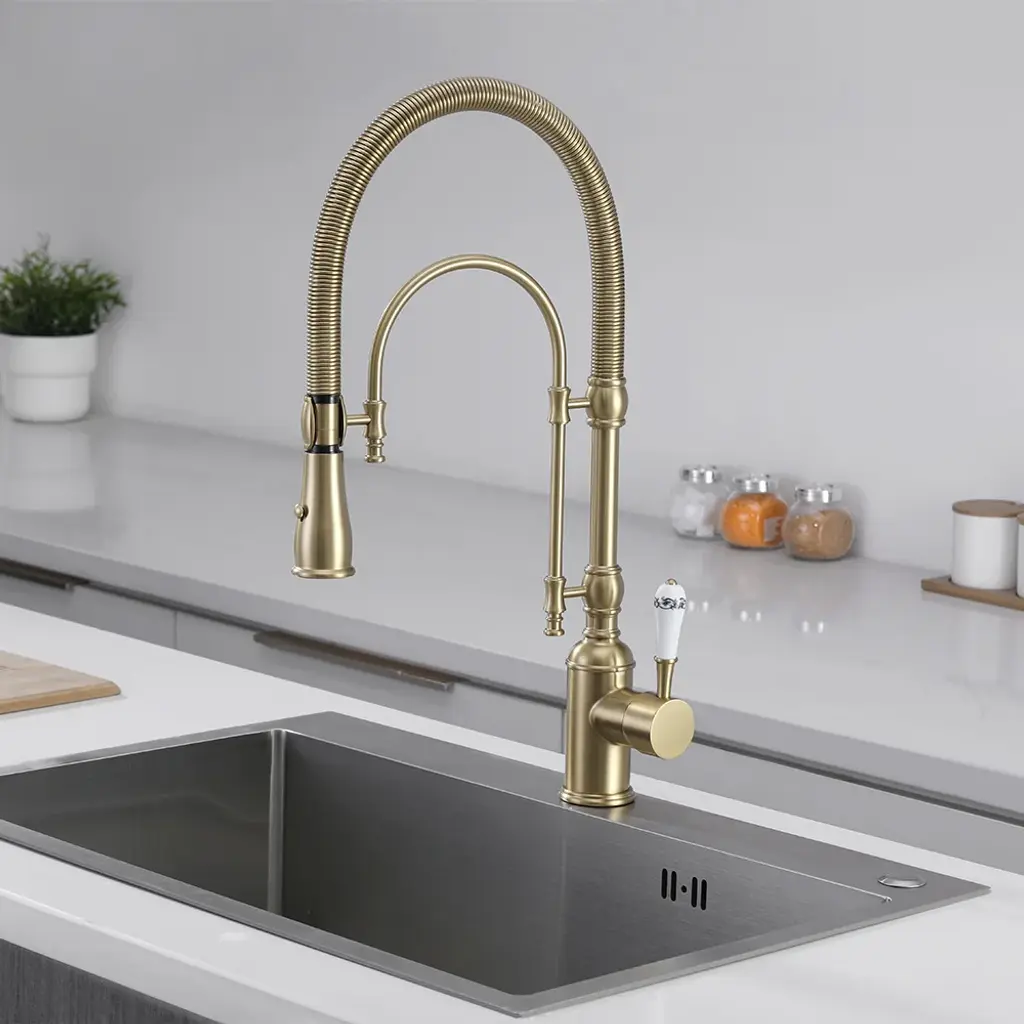 Brushed Gold High Arc Dual-Mode Pull-Down Kitchen Faucet Solid Brass Porcelain Handle