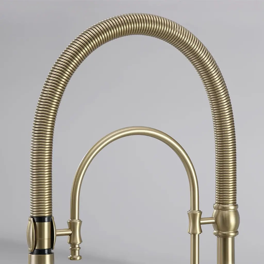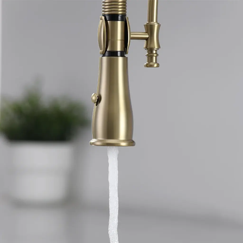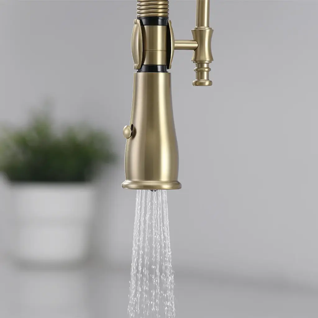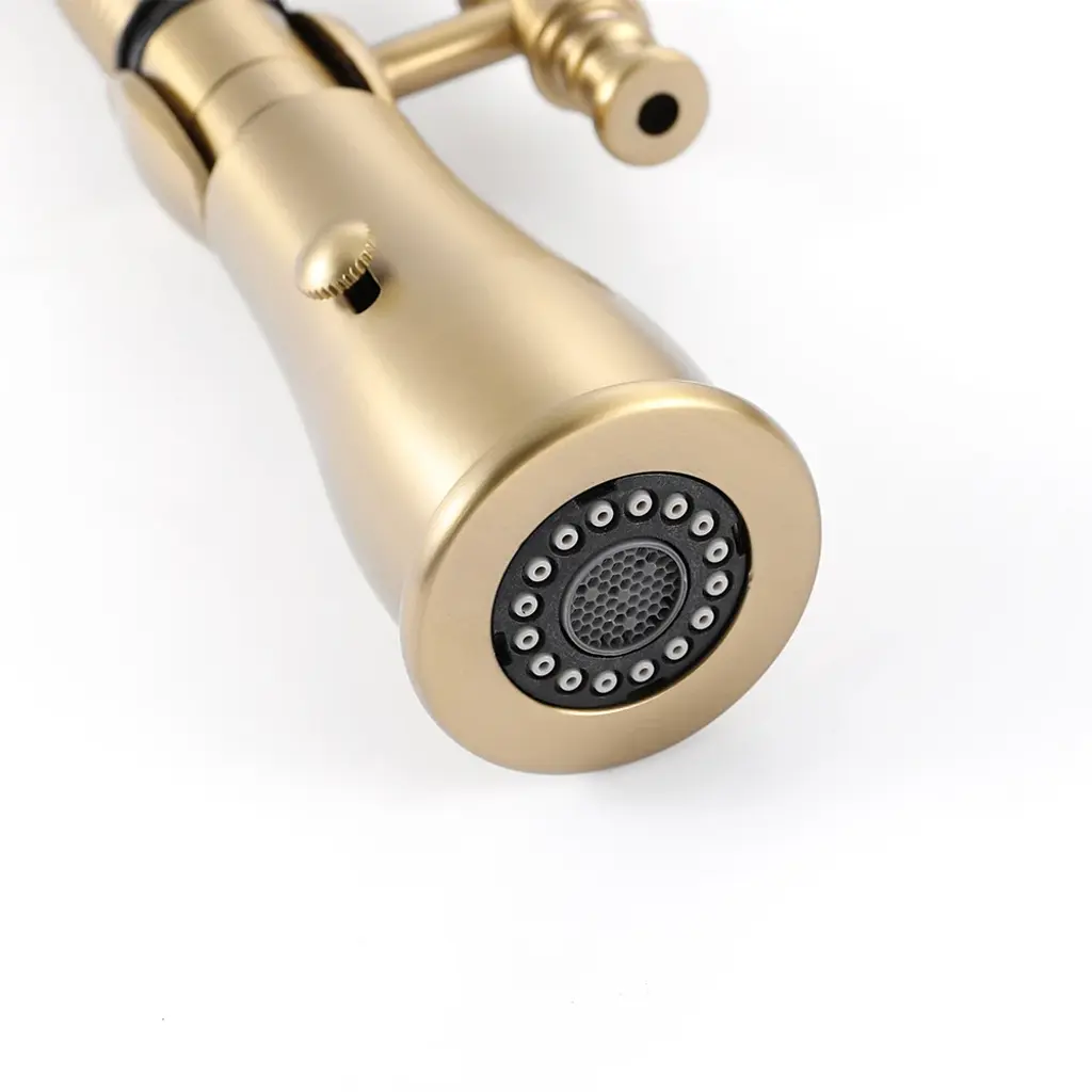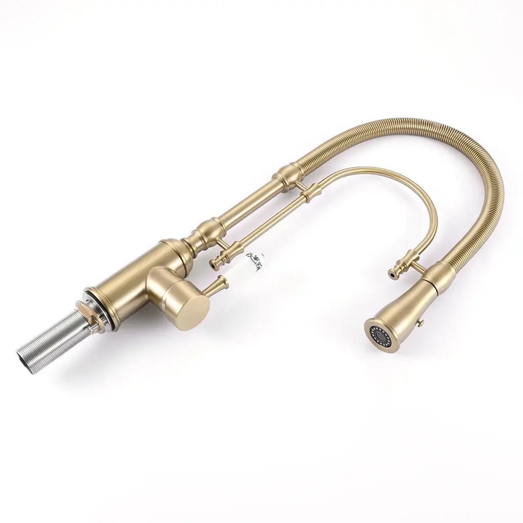 Brushed Gold High Arc Dual-Mode Pull-Down Kitchen Faucet Solid Brass Porcelain Handle