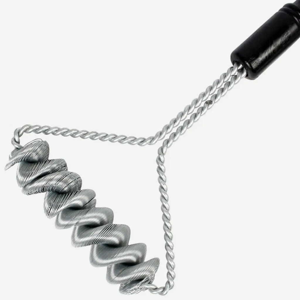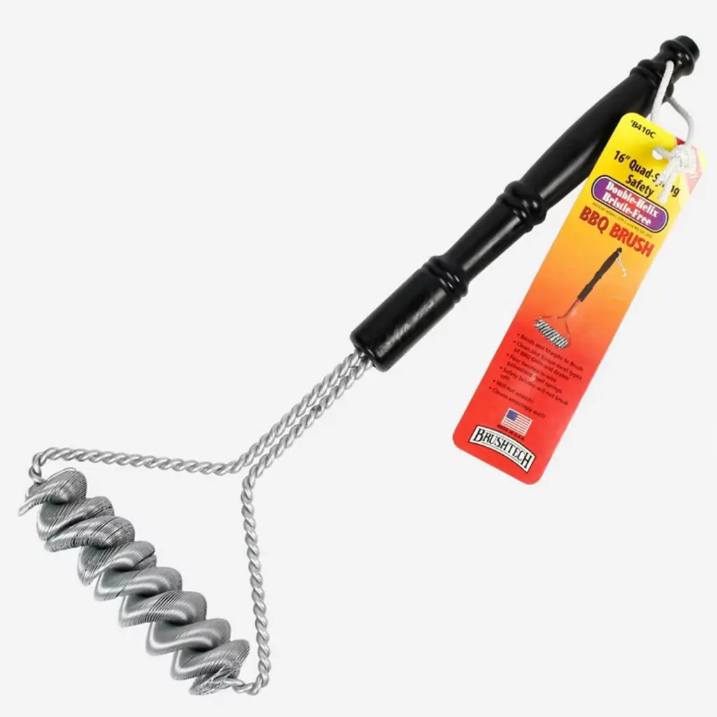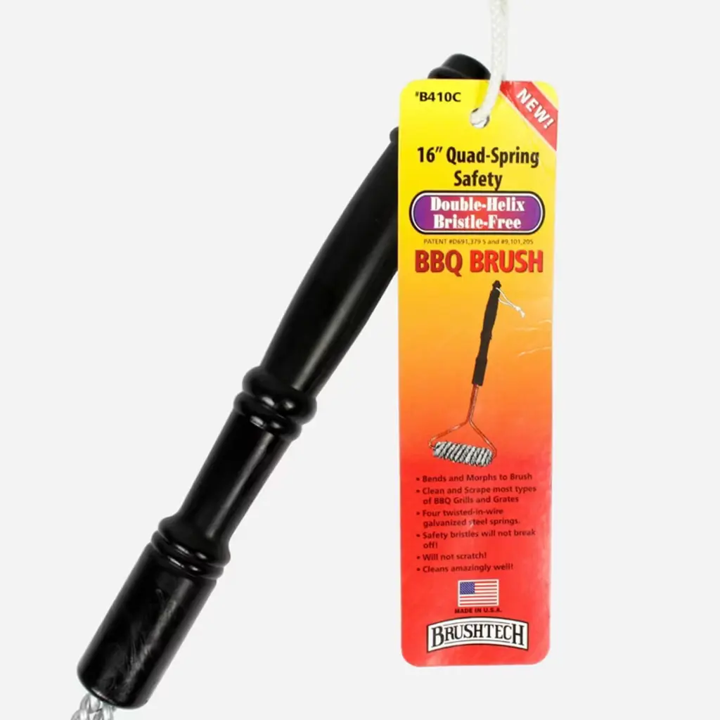 Tackle grill cleaning with confidence using the Brushtech 16" Quad Spring Safety Grill Brush. Designed with patented coil technology, this innovative tool features four nested, twisted-in-wire galvanized steel springs that bend and flex to clean every inch of your grill grates. The continuous brush head allows for effective debris removal on both the tops and sides of grates, making post-cookout maintenance quick and hassle-free. Unlike traditional wire brushes, this BBQ grill brush is completely food-safe, eliminating the risk of loose metal pieces contaminating your food. The tightly wound wire springs stay securely in place, providing a safe and efficient cleaning solution. Its 16-inch long handle offers the perfect balance of control and comfort, ensuring you can reach every area of the grill while keeping your hands protected from heat and grease. Built for durability, this heavy-duty grill cleaning brush is designed to withstand repeated use, tackling even the toughest grease and residue without bending or breaking. Whether you're using a charcoal, gas, or pellet grill, this tool delivers a deep clean to enhance your grilling experience. Proudly made in the USA, the Brushtech 16" Quad Spring Safety BBQ grill brush brings reliable performance and expert craftsmanship to every backyard barbecue. Keep your grill in top shape and enjoy cleaner, better-tasting food with every cookout.