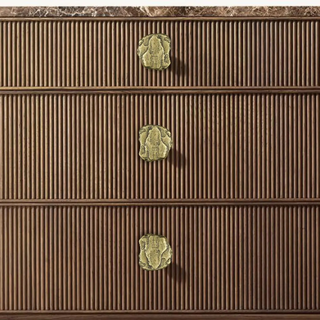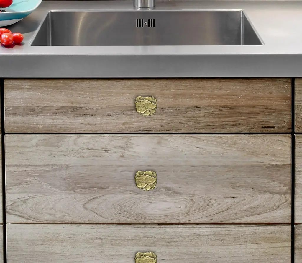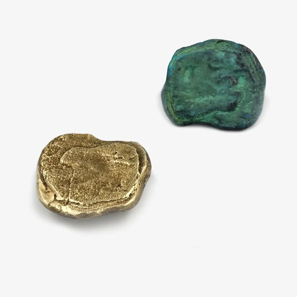 This cabinet handle in cast brass belongs to the Earth Prints collection, inspired by organic shapes and irregular textures found in nature. Each piece is crafted using a traditional sand casting process, resulting in an asymmetrical silhouette reminiscent of a weathered stone.The brass retains the imprint of its casting: visible indentations, raised areas, and natural imperfections form a dense and expressive surface. This deliberate irregularity enhances the raw quality of the material while revealing subtle refinement.Available in three patinated finishes: aged gold, bronze, or green grey patina, each version reveals unique tonal variations that shift with the light and emphasize the surface relief.Measuring 6.5 x 5.5 cm, this handle can be mounted on a variety of furniture pieces: kitchen cabinets, drawers, wardrobe doors, or built-in units. A through-bolt fixation ensures a secure and lasting installation. Over time, the untreated brass develops a natural patina, giving each handle its own evolving identity.note: Differences from the sample/photo provided should not be considered manufacturing defects, but rather a characteristic of the manual process, which may result in variations in color and uniformity.Brass is a living material that gradually develops a patina over the years.