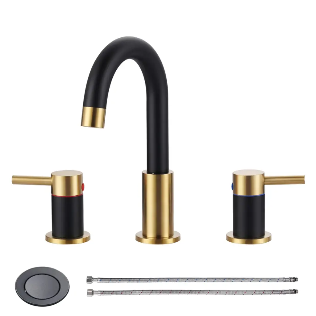This split-style bathroom sink faucet features a sleek C-shaped design that complements a wide range of bathroom aesthetics. The dual handles are crafted from high-quality copper with sturdy metal curved tubing, ensuring durability and timeless appeal. The faucet delivers a soothing waterfall flow, creating a refreshing, nature-inspired experience. Paired with a matching stainless-steel drain in a coordinated color, this set enhances your bathroom's style and reflects your impeccable taste.