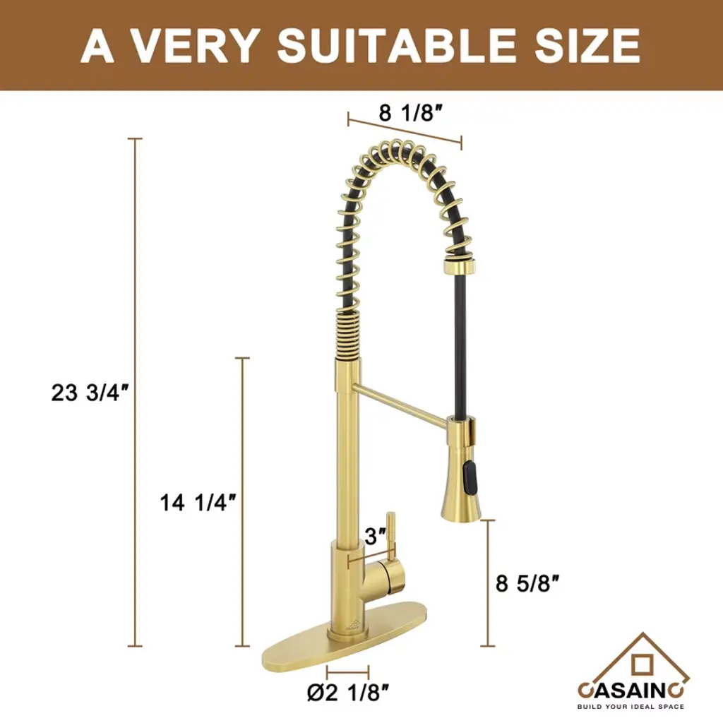 The kitchen faucet from CASAINC updates your kitchen with its sleek style and the superior functionality that is essential in every kitchen. Easy-to-use with a single handle design, this faucet has a convenient dual-function Spring pull-down sprayhead provides maximum flexibility for all your kitchen tasks and allows you to clean every hard-to-reach corner of your kitchen sink. It is easy to install in kitchens with 1 or 3-holes in the sink, making it the perfect choice for any faucet refresh.