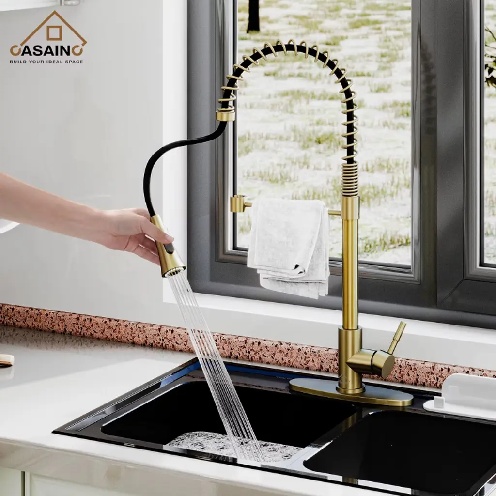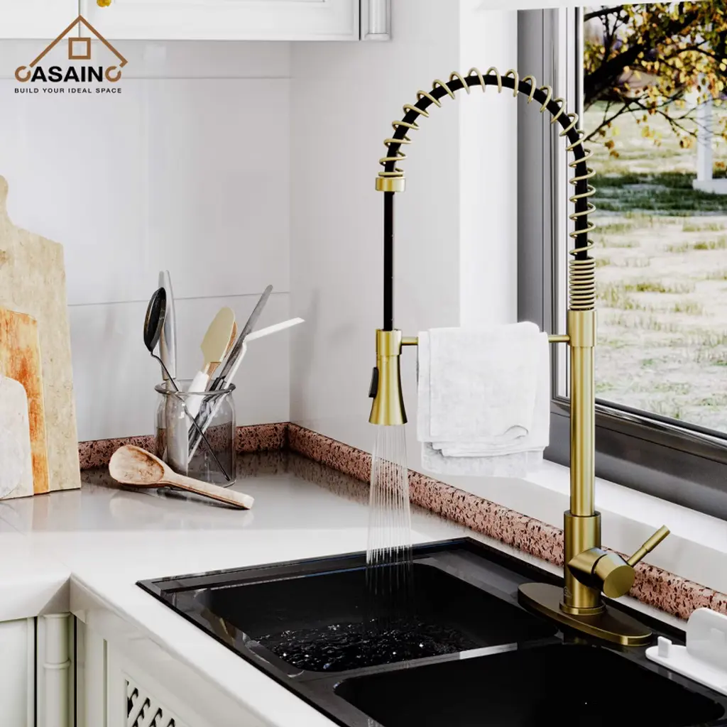 Casainc Deck Mounted 1-hole Single Handle Pulldown Kitchen Faucet, Brushed Gold
