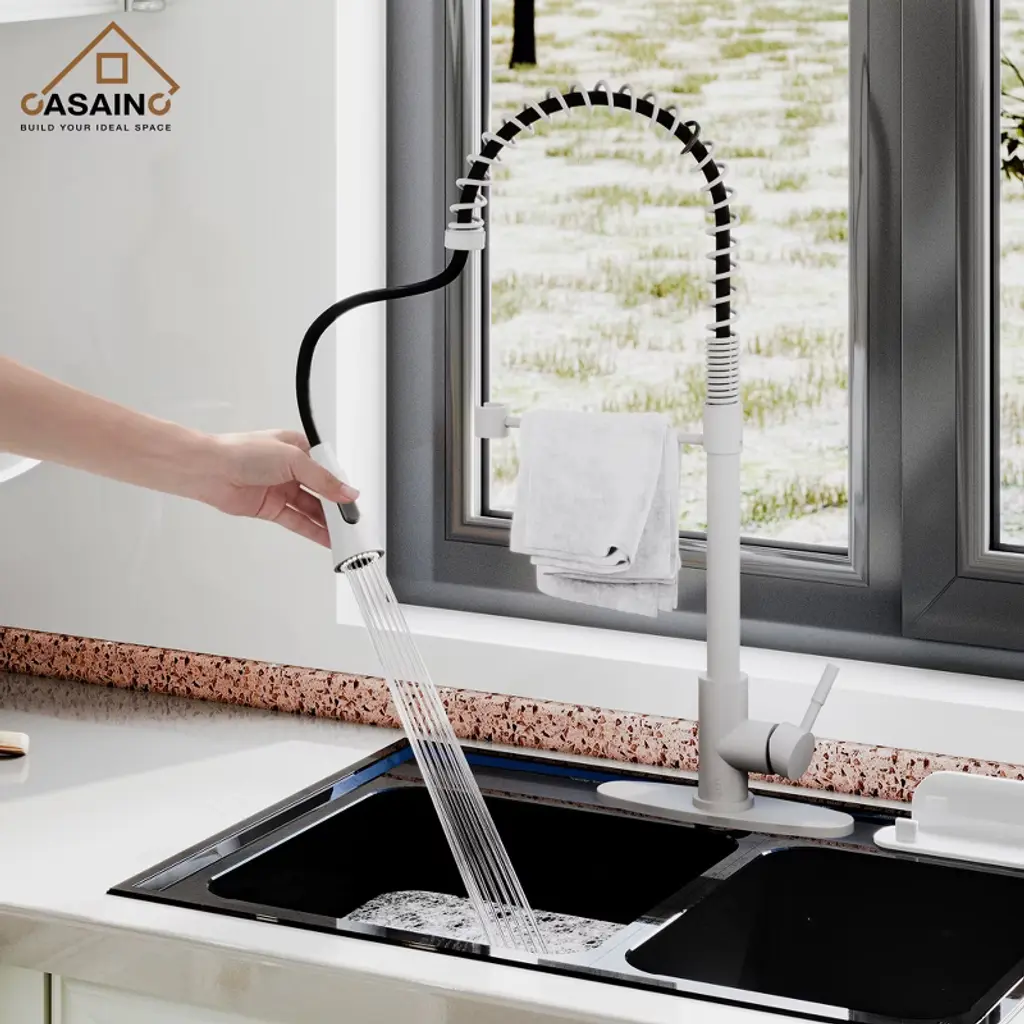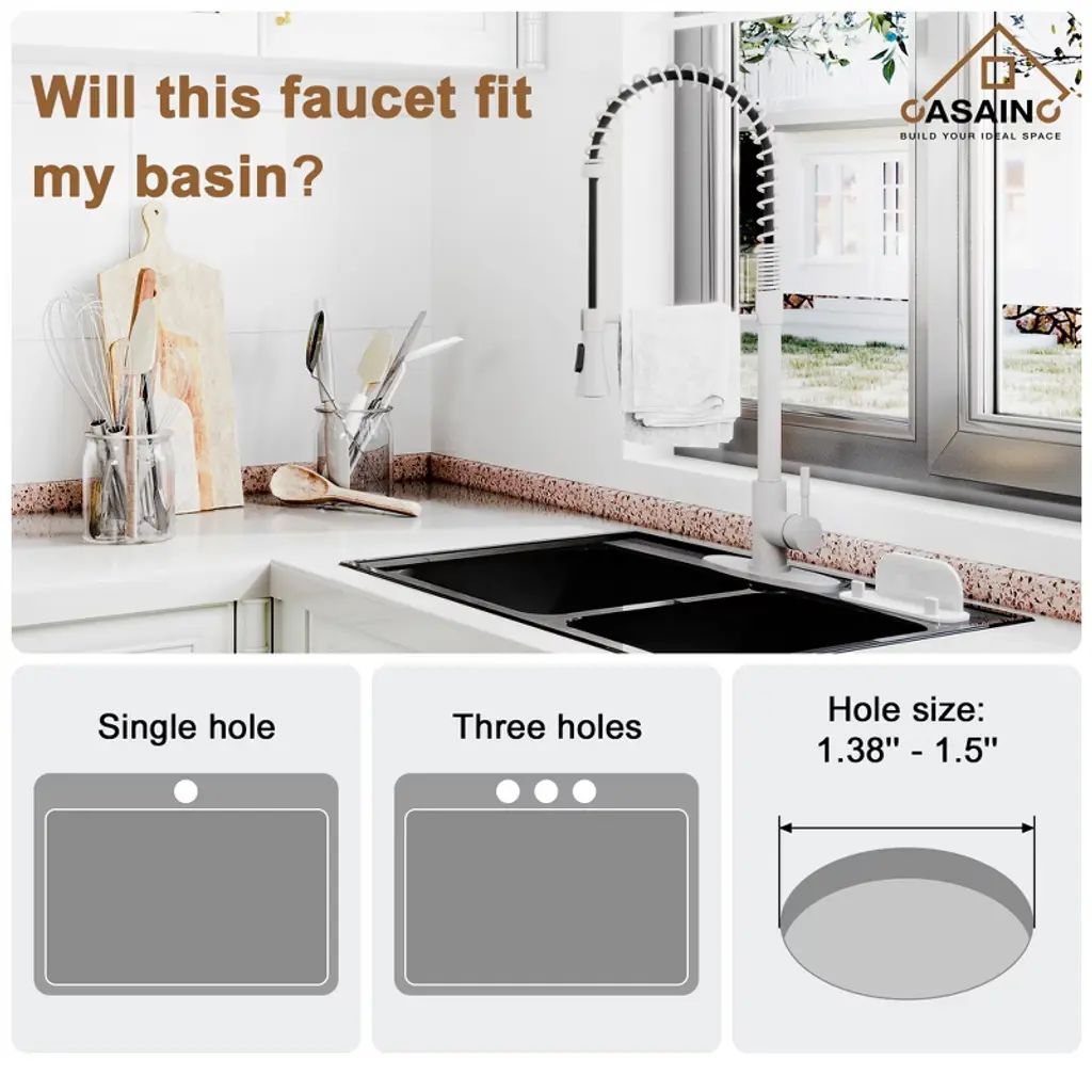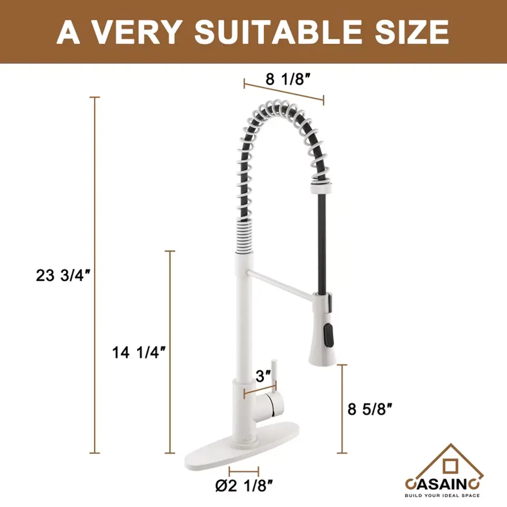 The kitchen faucet from CASAINC updates your kitchen with its sleek style and superior functionality that is essential in every kitchen. Easy to use with a single-handle design, this faucet has a convenient dual-function Spring pull-down spray head that provides maximum flexibility for all your kitchen tasks and allows you to clean every hard-to-reach corner of your kitchen sink. It is easy to install in kitchens with 1 or 3-holes in the sink, making it the perfect choice for any faucet refresh.