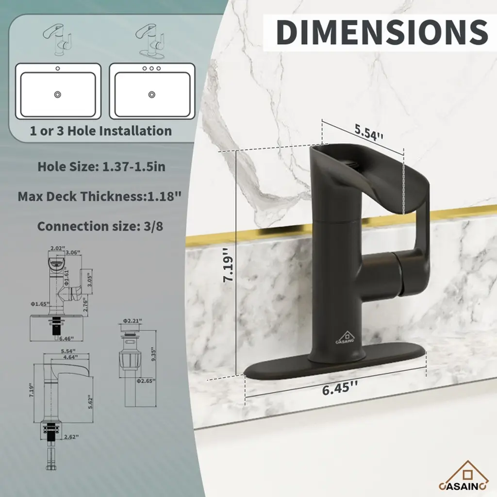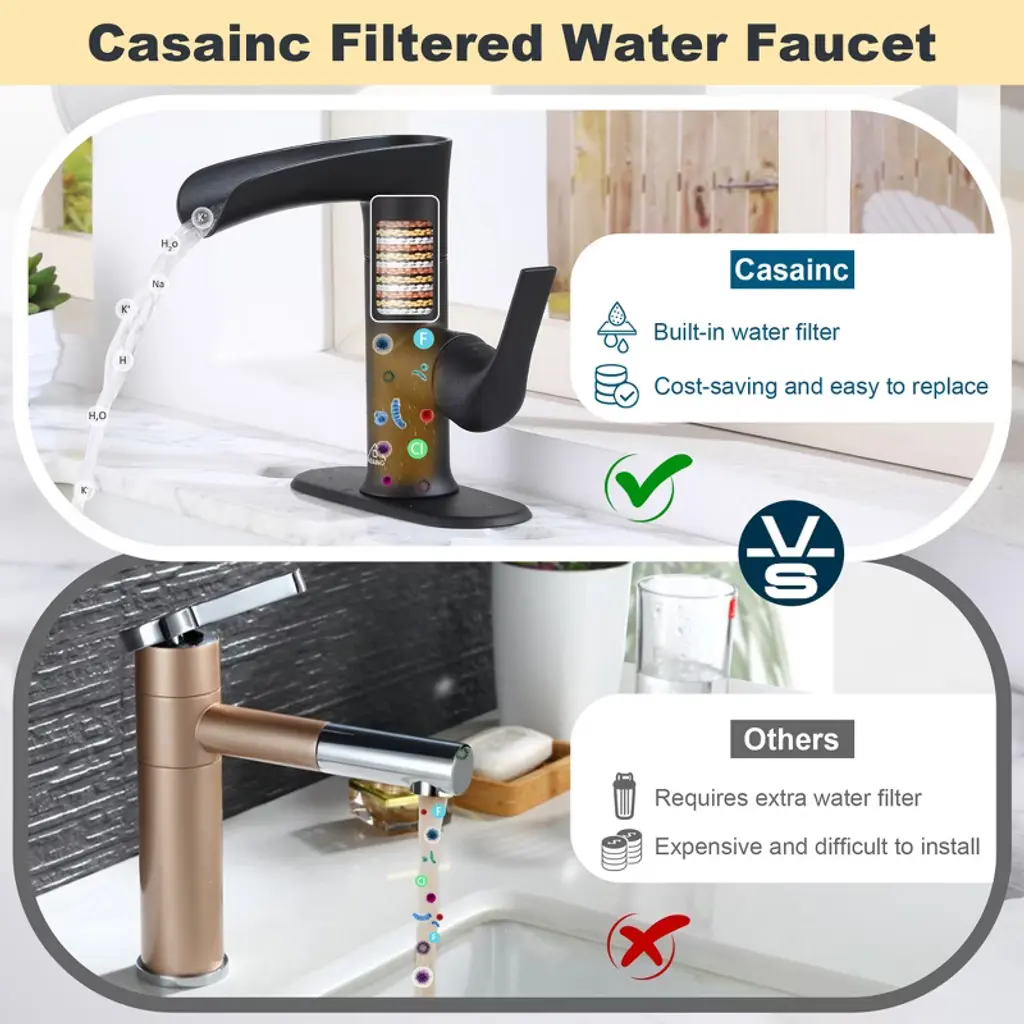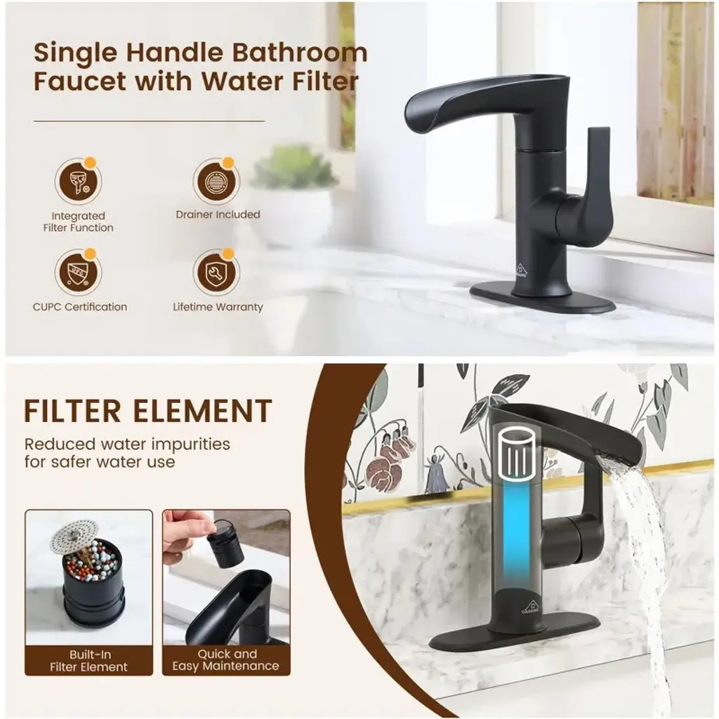 The Filtered Basin Faucet - provides clean and refreshing water for your daily needs. Not only does this faucet come with a built-in filter cartridge for efficient water filtration, but it also includes a drainer for added convenience. The filter cartridge features KDF particles, known for their ability to remove chlorine, and heavy metals, and inhibit the growth of microorganisms. With a combination of KDF (copper-zinc alloy) particles weighing 0.25oz, calcium sulfite particles weighing 0.25oz, and diatomaceous earth particles weighing 0.21oz, this filter provides exceptional water purification. You have the option to replace or remove them based on their preferences. Experience the soothing and refreshing flow of water with the waterfall design of this basin faucet. Create a luxurious and hygienic bathroom environment with the Filtered Basin Faucet. Elevate your bathroom experience with the CASAINC Waterfall Sink Faucet — where elegant design meets everyday wellness. Thoughtfully engineered with a built-in filtration system, this single-handle faucet delivers both form and function for the discerning homeowner, contractor, or designer. Enjoy clean, filtered water directly from your sink thanks to an integrated filtration cartridge containing KDF, calcium sulfite, and diatomaceous earth — ideal for reducing chlorine, heavy metals, and microbial buildup. The open trough waterfall spout creates a tranquil, spa-like effect while ensuring a steady and soothing water flow.