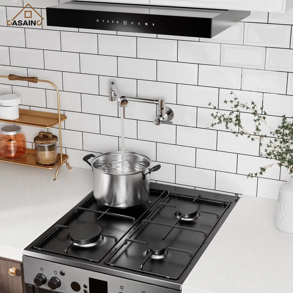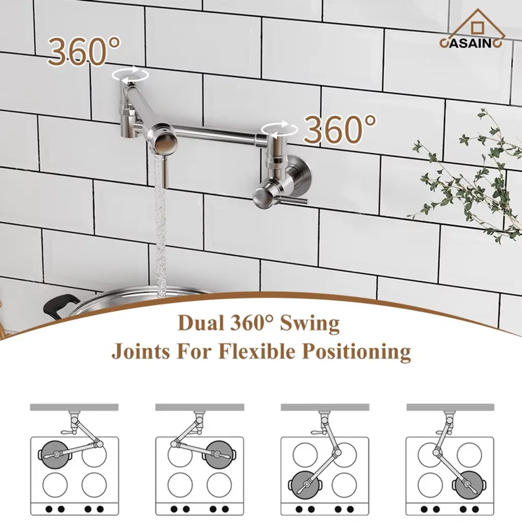 Upgrade your kitchen with the convenience and efficiency of a wall-mounted pot filler faucet, designed to simplify your cooking routine. Featuring a smooth dual-joint swing arm, this faucet extends over your stovetop to fill large pots directly—eliminating the need to carry heavy cookware from the sink and reducing spills and strain. Made from premium, corrosion-resistant materials, this space-saving faucet is both stylish and functional. The foldable design tucks neatly against the wall when not in use, while the 360-degree swivel ensures effortless maneuverability. Perfect for busy kitchens, home chefs, and anyone who values both form and function in their cooking space. Bring restaurant-style efficiency into your home with this must-have kitchen pot filler faucet that makes everyday cooking faster, safer, and more enjoyable.