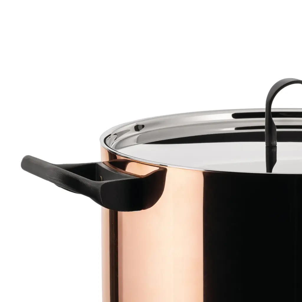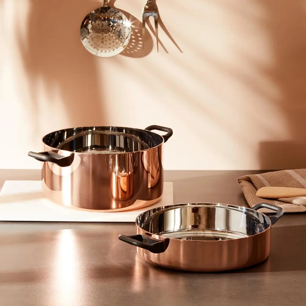The Two-Handle Casserole from the “La Cintura di Orione” series is an embodiment of the culinary vision shared by Richard Sapper and renowned chef Gualtiero Marchesi. This masterfully constructed piece marries the heat conduction properties of copper with the resilience of steel, resulting in professional-grade performance for your home kitchen. It’s ideally suited for a multitude of cooking methods, including braising, stewing, roasting, and preparing sumptuous risottos. The dual-handle design ensures comfortable handling and stability. This two-handle casserole is more than a tool; it’s an enhancement to your culinary journey, inviting you to explore gourmet recipes with unmatched precision and ease. Experience the joy of professional cooking at home with the “La Cintura di Orione” Two-Handle Casserole.