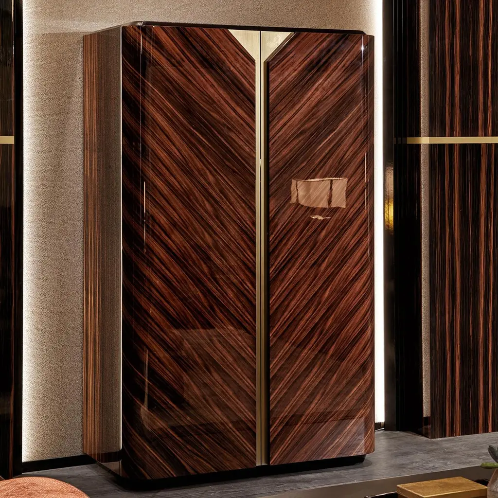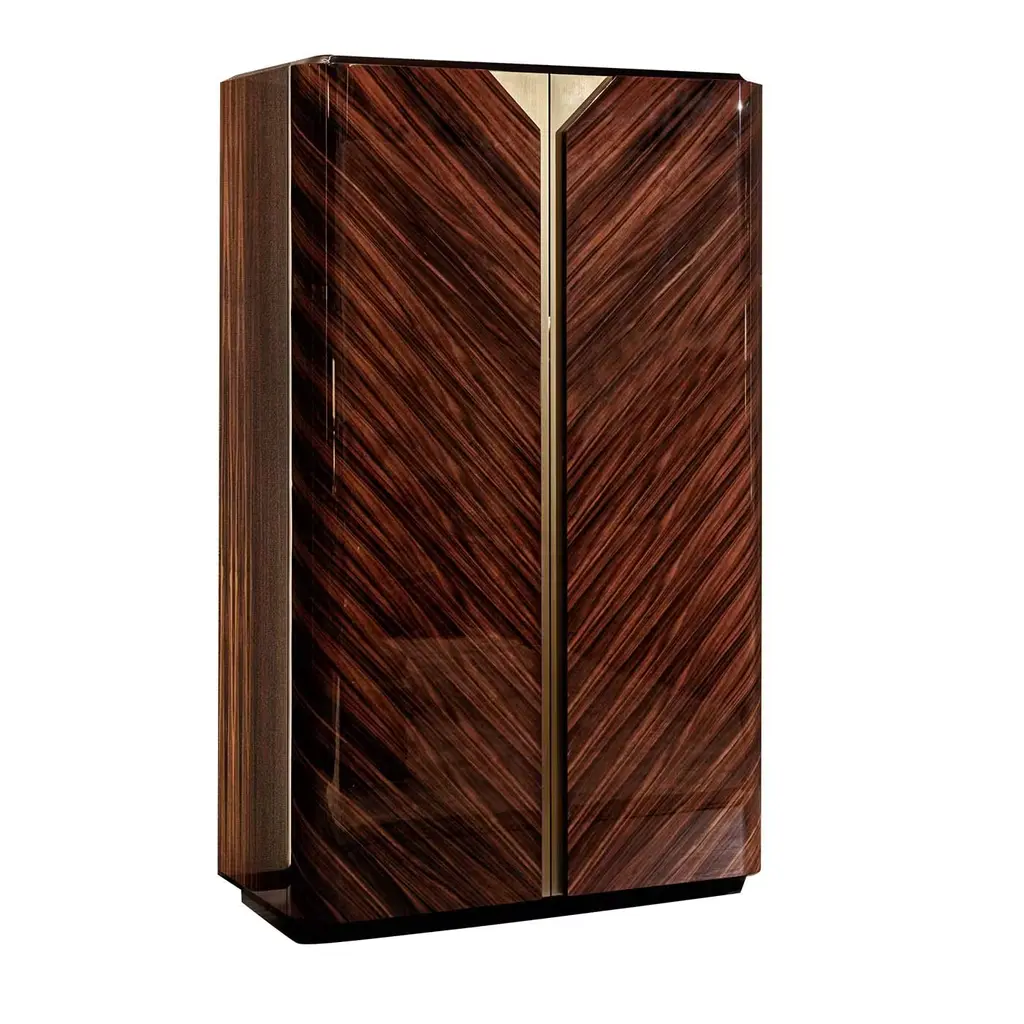 Natural beauty is the central element of the Chandler Cabinet, designed for warm, contemporary living spaces. Crafted in wood, the cabinet features Macassar ebony veneer carefully positioned to create a chevron design, exalted by a glossy finish. Completed with gold-tone handles, the cabinet is a stunning piece to enjoy for ages. A smaller bar cabinet version is also available.