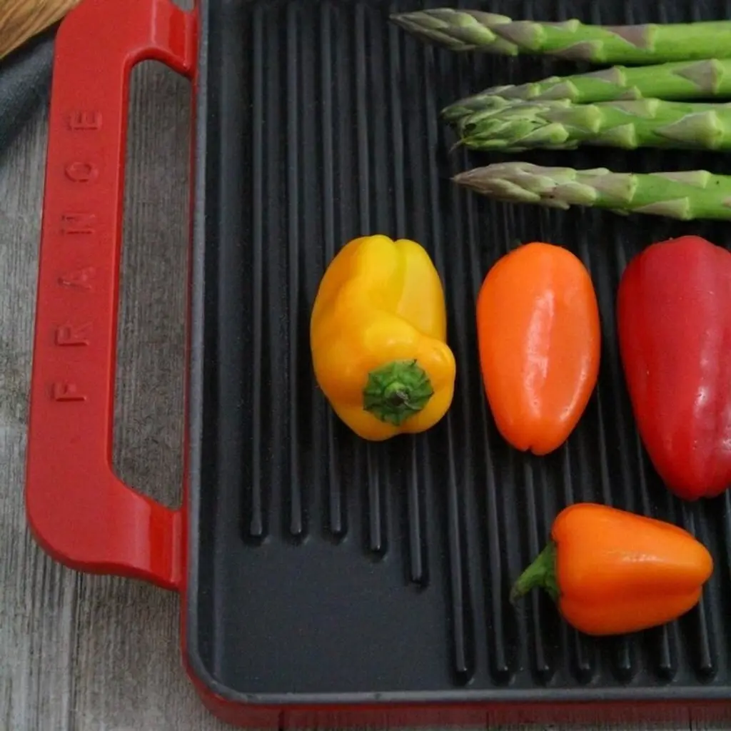 A durable cast iron construction makes this rectangular griddle perfect for making delicious burgers, fajitas, bacon and more. Finished in a bright chili red enamel, this handled griddle will add a pop of vivid color to your kitchen.Set includes: One (1) griddleConstruction: Enamel over cast ironSurface: Non-reactiveMaterials: Cast ironLid material: Cast ironHandle attachment: RivetedCare instructions: Dishwasher-safe, hand wash recommendedFinish: SatinDimensions: 10 inches wide x 14 inches longOven safe to: 450° FahrenheitDouble enameled cast ironMade in France