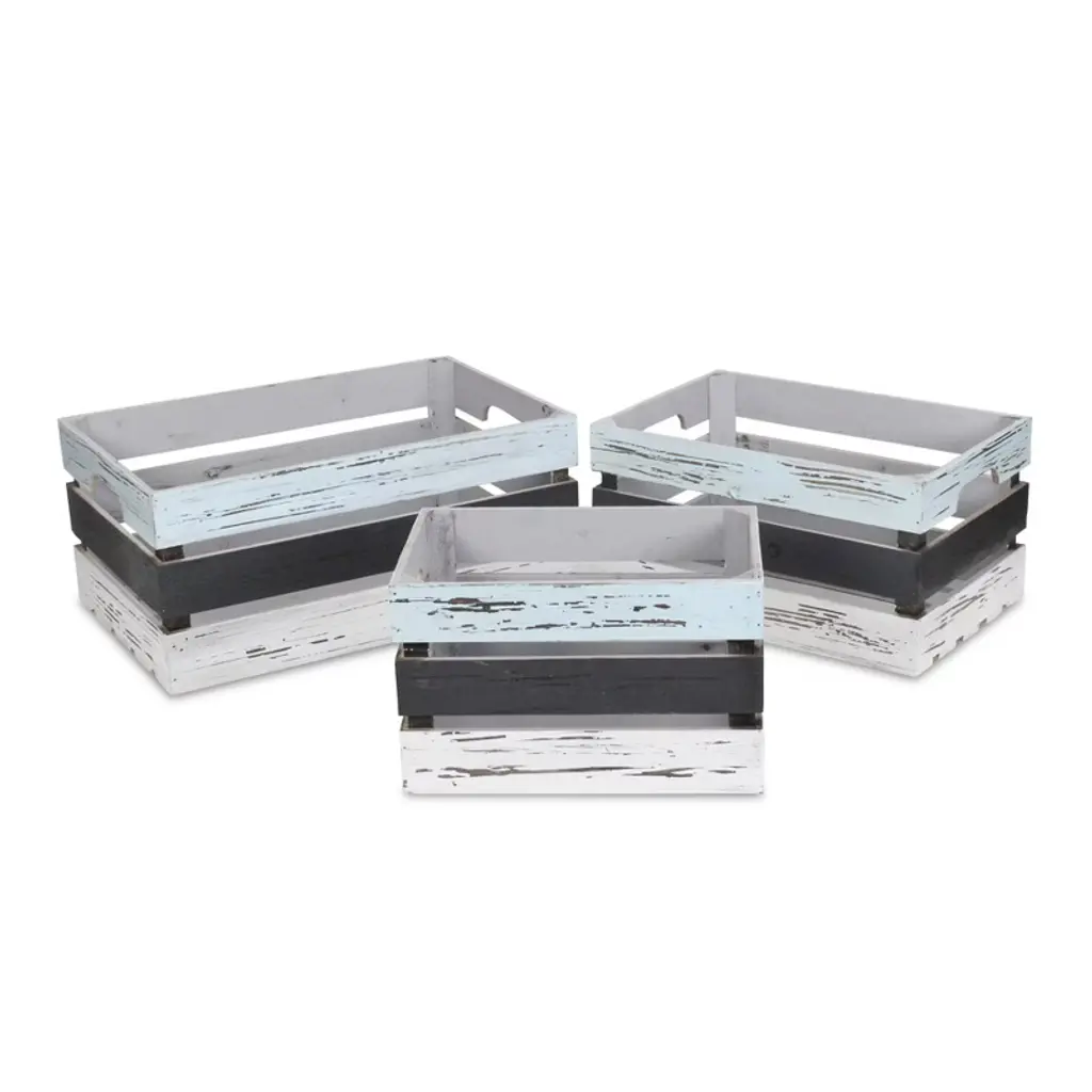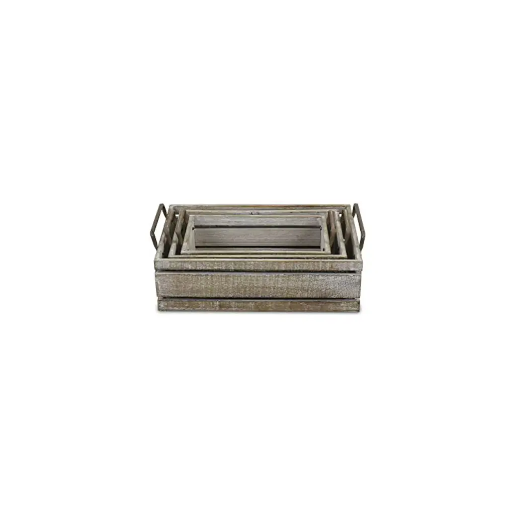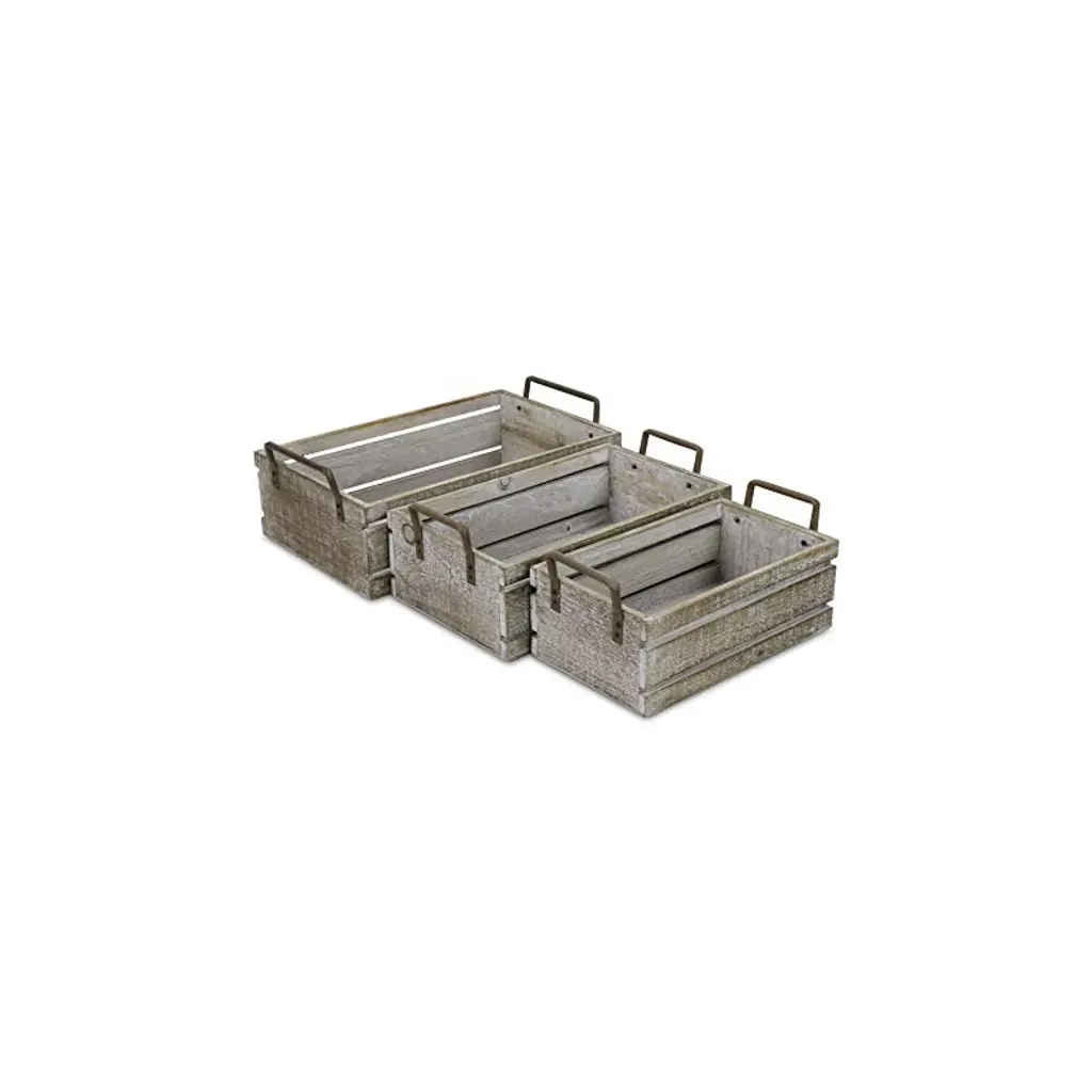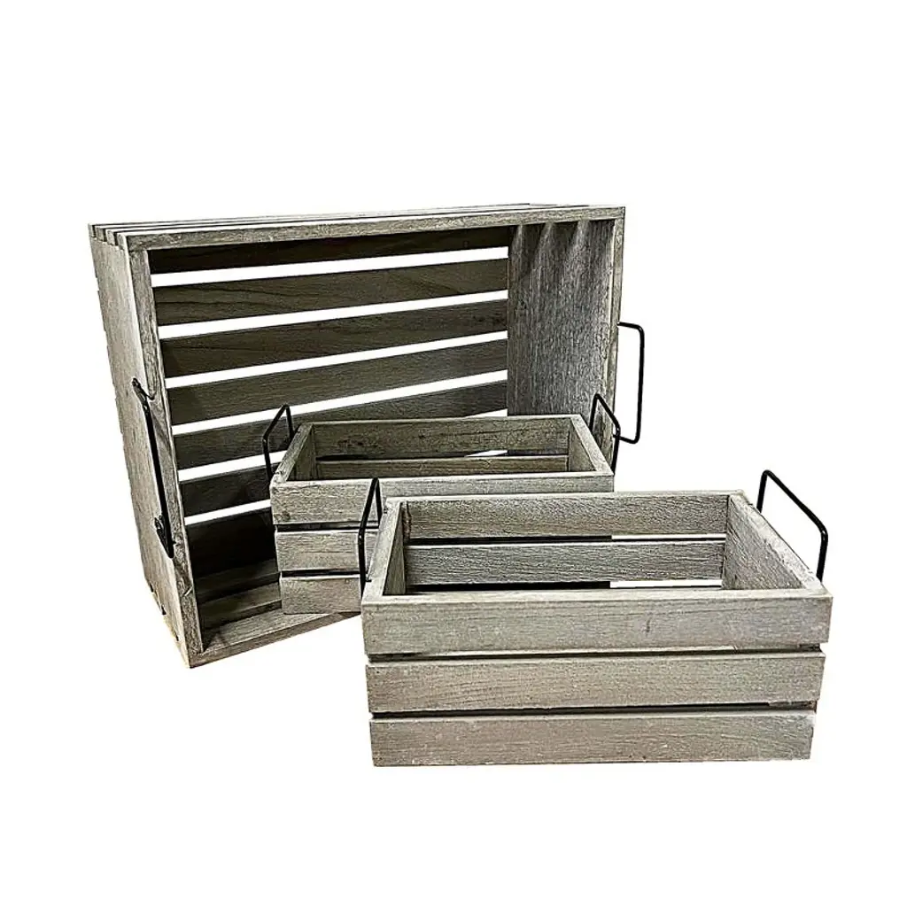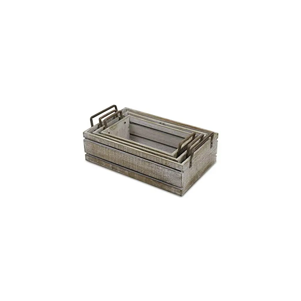 A stylish set of crates has been a timeless addition to every home. Serving a variety of uses from storage to decorative center pieces, crates have remained a stable addition to the American dream home. This piece features a rectangular, gray washed, slatted wood design with side metal handles. With its blend of style and functionality, these crates will be a wonderful addition to your home or space.
