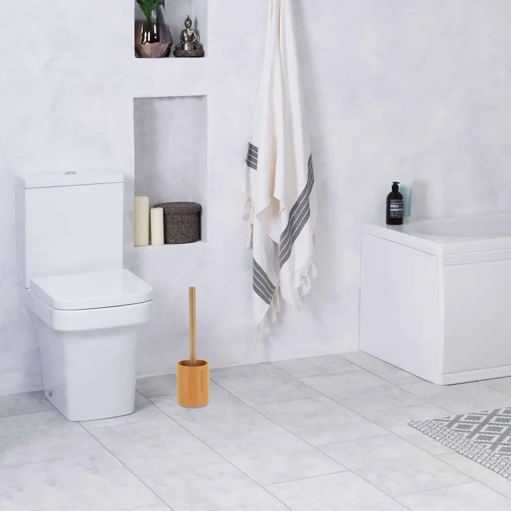 Introducing our Sleek Toilet Brush with Bamboo Handle, a perfect blend of elegance and functionality. This exquisite toilet brush set, designed with a sophisticated matte finish, instantly enhances the aesthetic of any bathroom. It features a natural bamboo handle, which adds a touch of natural warmth to its modern design. Additionally, this toilet brush holder set is made from high-quality polyresin, ensuring its durability and resistance to everyday wear and tear. Its compact size means it fits perfectly into any bathroom, maximizing space without sacrificing style. Also, the bamboo handle offers a comfortable grip, making cleaning easier and more efficient. Moreover, the toilet brush holder has a neutral yet refined look that complements many bathroom decors. Its surface is easy to clean, preserving its impeccable appearance and hygiene. Furthermore, this toilet bowl brush set is versatile enough to adapt to contemporary or classic bathroom themes. Discover the perfect harmony between function and fashion with this elegant Toilet Brush Set. Imported from France, Made in China