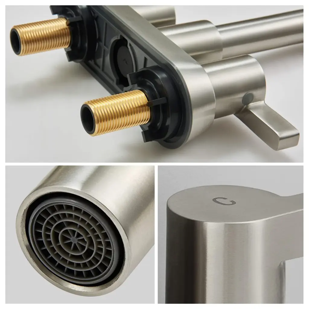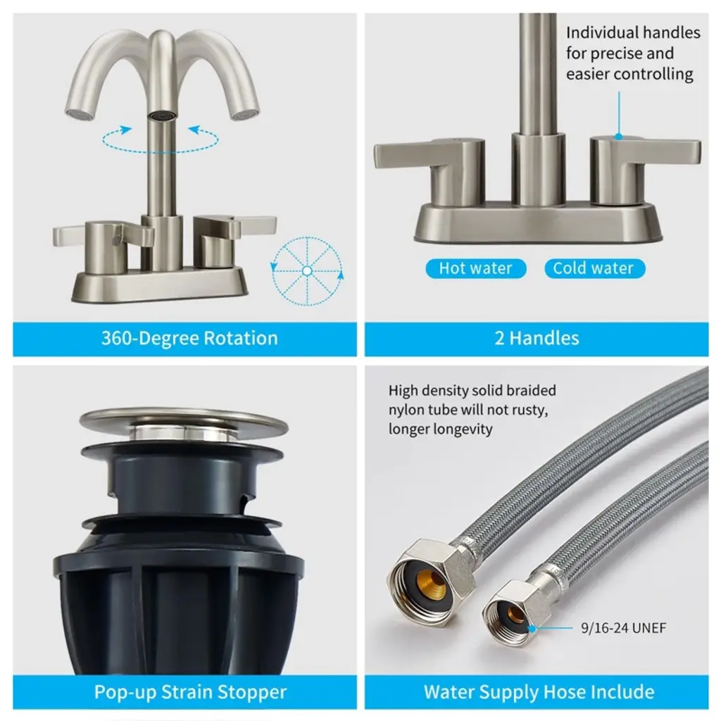 ChicFurnit bathroom sink faucet combines style and durability for your bathroom. Made with high-quality stainless steel and a lead-free waterway, it resists corrosion and maintains long-lasting durability. The 360-degree swivel spout and double straight handles allow easy control over water temperature and flow. With a high arc design and an easy-to-clean nozzle, installation is a breeze and the faucet fits comfortably into most bathroom designs with a simple, sleek look.