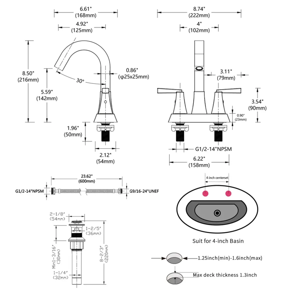 ChicFurnit Bathroom Sink Faucet offers easy installation with step-by-step instructions, taking about 20 minutes. Its corrosion-resistant surface prevents rust and scratches, ensuring low-maintenance and a fresh look. The precise two-handle design allows for effortless control of water flow and temperature. This complete set includes the faucet, a pop-up drain with overflow, and hot and cold water supply lines, providing everything you need for a convenient installation.