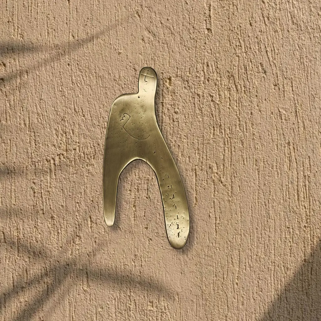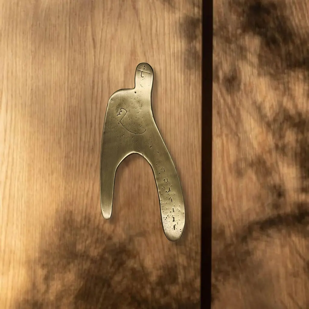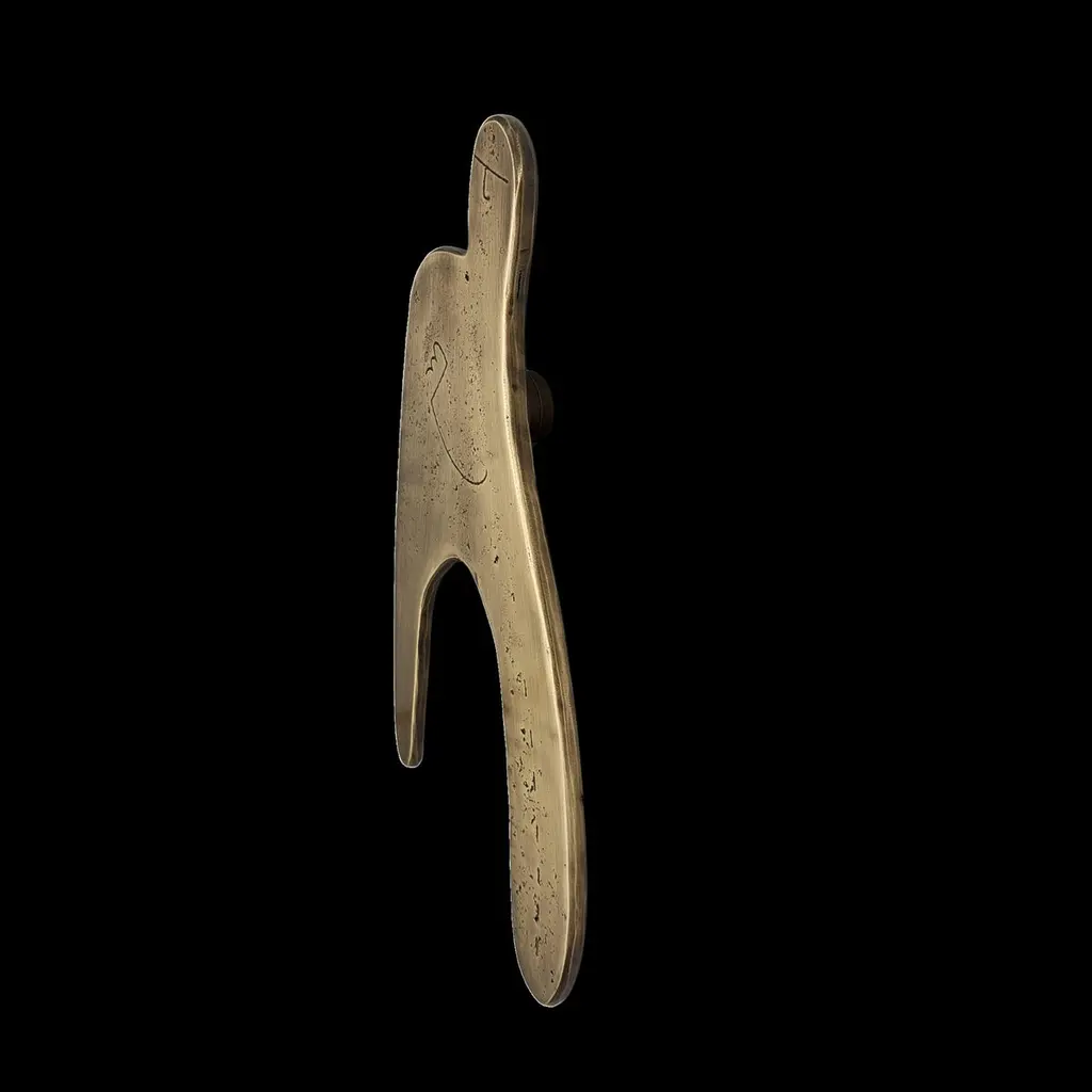 Use: Indoor or protected outdoorThis solid brass door pull features a wide and fluid silhouette, with lines that suggest a figure caught in a state of controlled imbalance. The shape, both naive and expressive, unfolds with spontaneity, animated by a gestural energy.Each piece is handcrafted: the brass is cast, worked, and patinated by hand, revealing natural irregularities and unique variations in tone. The aged gold finish lends warmth and depth to the surface of the metal.Measuring 29 cm in height and 14 cm in width, this surface-mounted pull can be installed on a door, piece of furniture, or wall panel. A joyful tribute to raw materials, primitive forms, and cross-cultural inspirations.note: Differences from the sample/photo provided should not be considered manufacturing defects, but rather a characteristic of the manual process, which may result in variations in color and uniformity.When placed outdoors, finishes may undergo color changes, which should not be considered a defect. Brass is a living material that gradually develops a patina over the years.