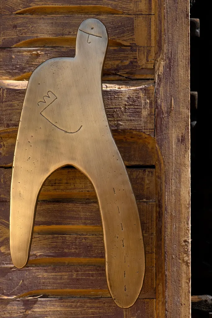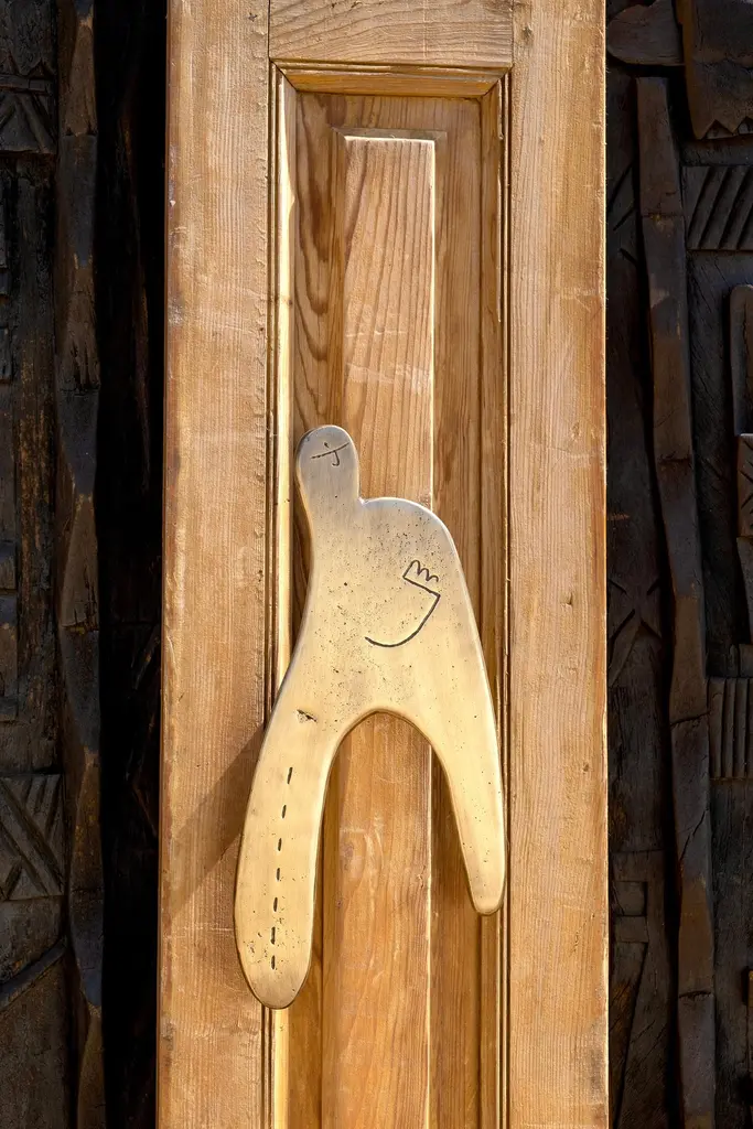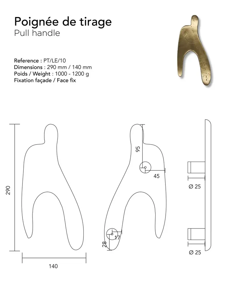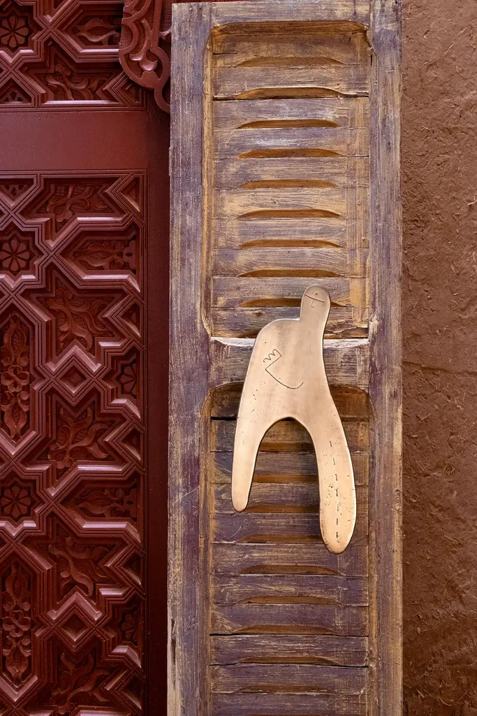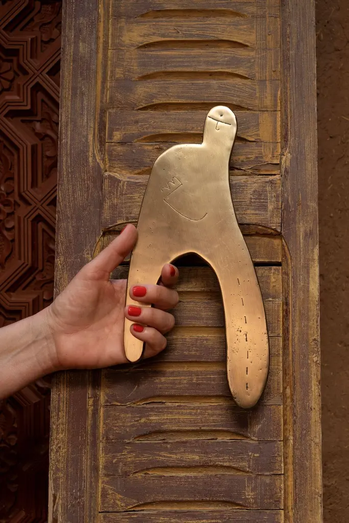 Use: Indoor or protected outdoorThis solid brass door pull features a wide and fluid silhouette, with lines that suggest a figure caught in a state of controlled imbalance. The shape, both naive and expressive, unfolds with spontaneity, animated by a gestural energy.Each piece is handcrafted: the brass is cast, worked, and patinated by hand, revealing natural irregularities and unique variations in tone. The aged gold finish lends warmth and depth to the surface of the metal.Measuring 29 cm in height and 14 cm in width, this surface-mounted pull can be installed on a door, piece of furniture, or wall panel. A joyful tribute to raw materials, primitive forms, and cross-cultural inspirations.note: Differences from the sample/photo provided should not be considered manufacturing defects, but rather a characteristic of the manual process, which may result in variations in color and uniformity.When placed outdoors, finishes may undergo color changes, which should not be considered a defect. Brass is a living material that gradually develops a patina over the years.