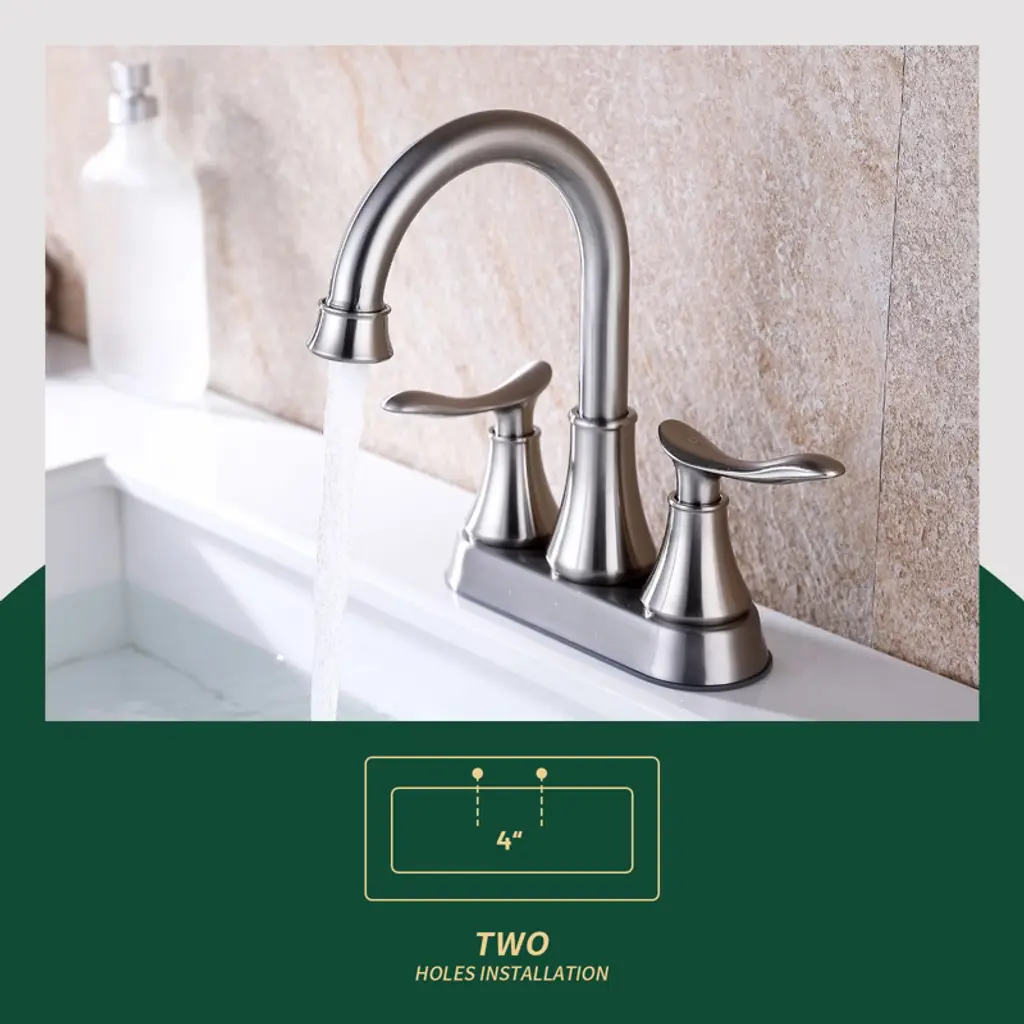 Our bathroom faucets are made of high quality materials that are durable and corrosion resistant. The professionally tested ceramic cartridge ensures that the faucet will not leak or drip and is durable. Perfect for new house renovation, old house renovation, high-end villas, high-end apartments, luxury hotels, elite and middle class. HIGH QUALITY MATERIALS & DESIGN : Exquisite bathroom sink faucet is rust and corrosion resistant to ensure durability. Dual Handle Metal Handle; The dual handle handle bathroom faucet is designed for precise control of water volume and water temperature, and the advanced ceramic cartridge prevents leaks and drips. WATER CONSERVATION: Imported ABS aerator of 2-hole mount 4-inch center bathroom sink faucet enhances the dense foaming effect, the water flow is dense and soft without splashing, which improves water conservation efficiency. Suitable for rental houses, new apartments, bachelor pads, motels, travel trailers and homes. EASY INSTALLATION: The bathroom faucet is designed to help you save money by following the instructions and installing it in less than 30 minutes without a plumber. Everything you need is included in the box (including the pop-up drain and stainless steel braided inlet hose). 360° Swivel: The 360-degree swivel nozzle provides a full range of cleaning for your bathroom sink.