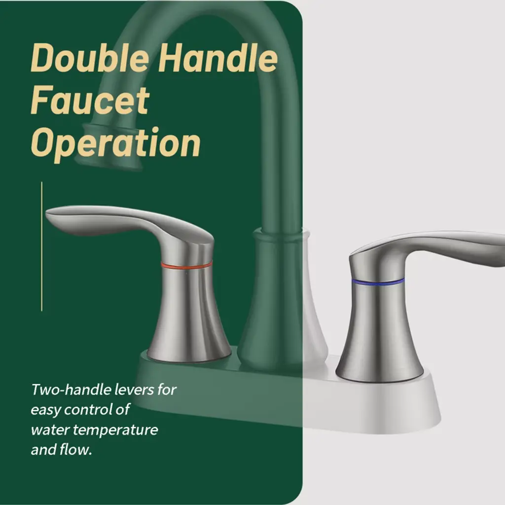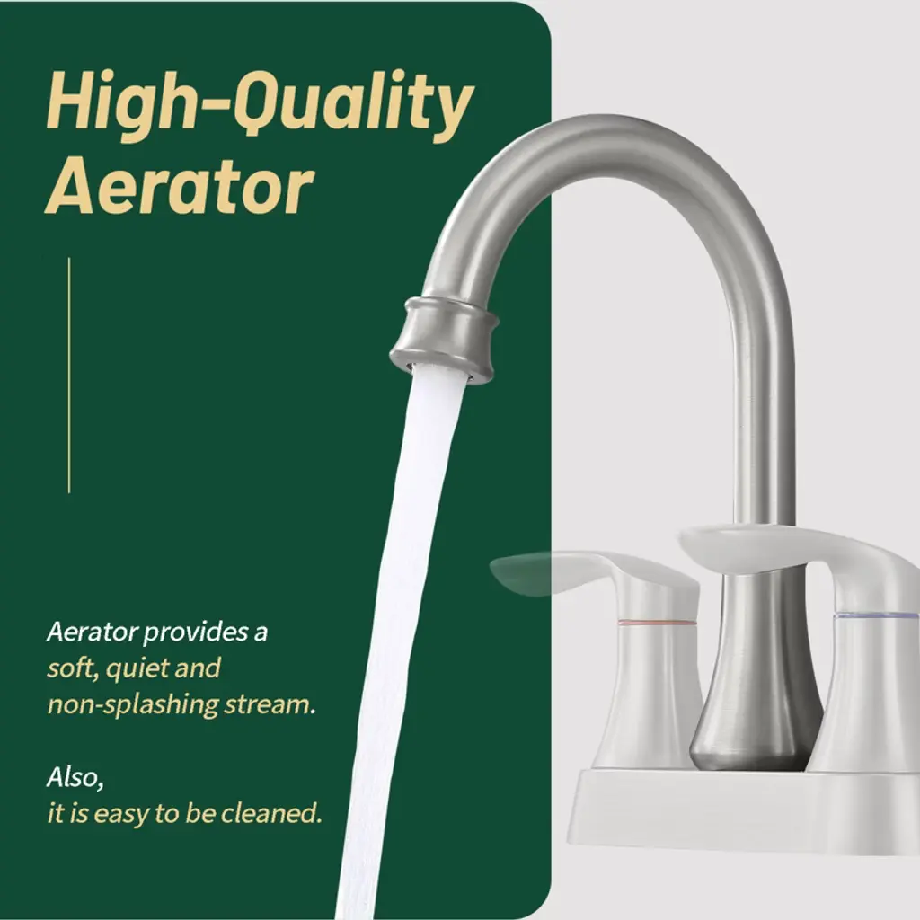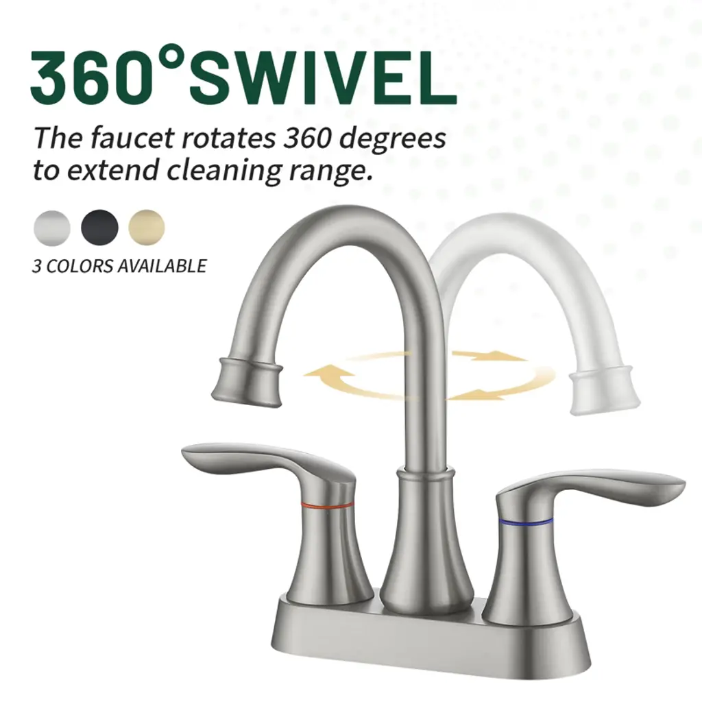 Our bathroom faucets are made of high quality materials that are durable and corrosion resistant. The professionally tested ceramic cartridge ensures that the faucet will not leak or drip and is durable. Perfect for new house renovation, old house renovation, high-end villas, high-end apartments, luxury hotels, elite and middle class. HIGH QUALITY MATERIALS & DESIGN : Exquisite bathroom sink faucet is rust and corrosion resistant to ensure durability. Dual Handle Metal Handle; The dual handle handle bathroom faucet is designed for precise control of water volume and water temperature, and the advanced ceramic cartridge prevents leaks and drips. WATER CONSERVATION: Imported ABS aerator of 2-hole mount 4-inch center bathroom sink faucet enhances the dense foaming effect, the water flow is dense and soft without splashing, which improves water conservation efficiency. Suitable for rental houses, new apartments, bachelor pads, motels, travel trailers and homes. EASY INSTALLATION: The bathroom faucet is designed to help you save money by following the instructions and installing it in less than 30 minutes without a plumber. Everything you need is included in the box (including the pop-up drain and stainless steel braided inlet hose). 360° Swivel: The 360-degree swivel nozzle provides a full range of cleaning for your bathroom sink.