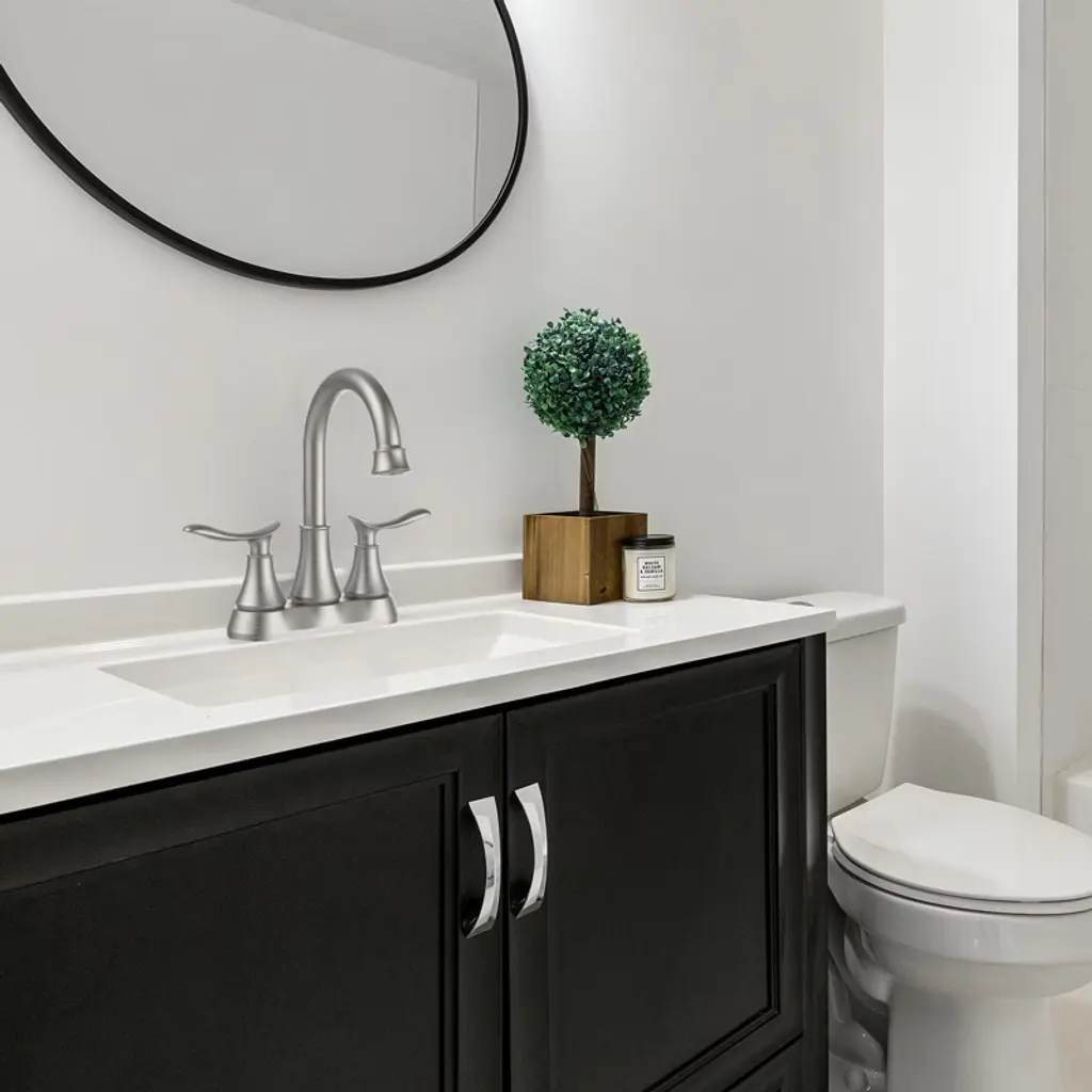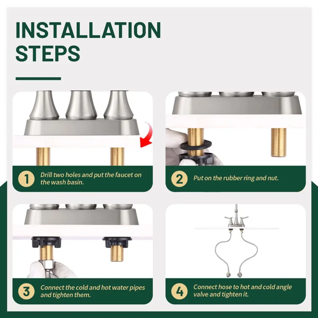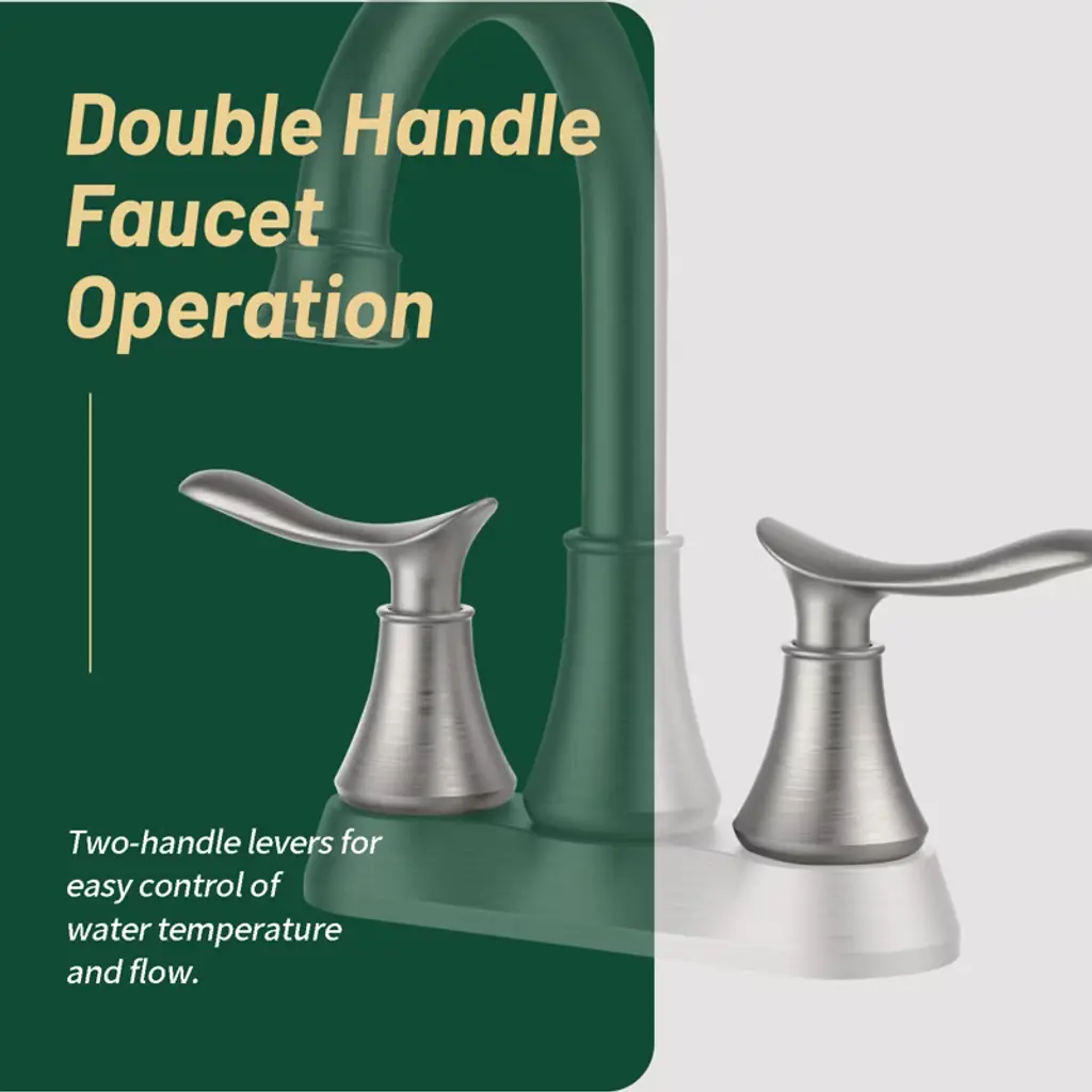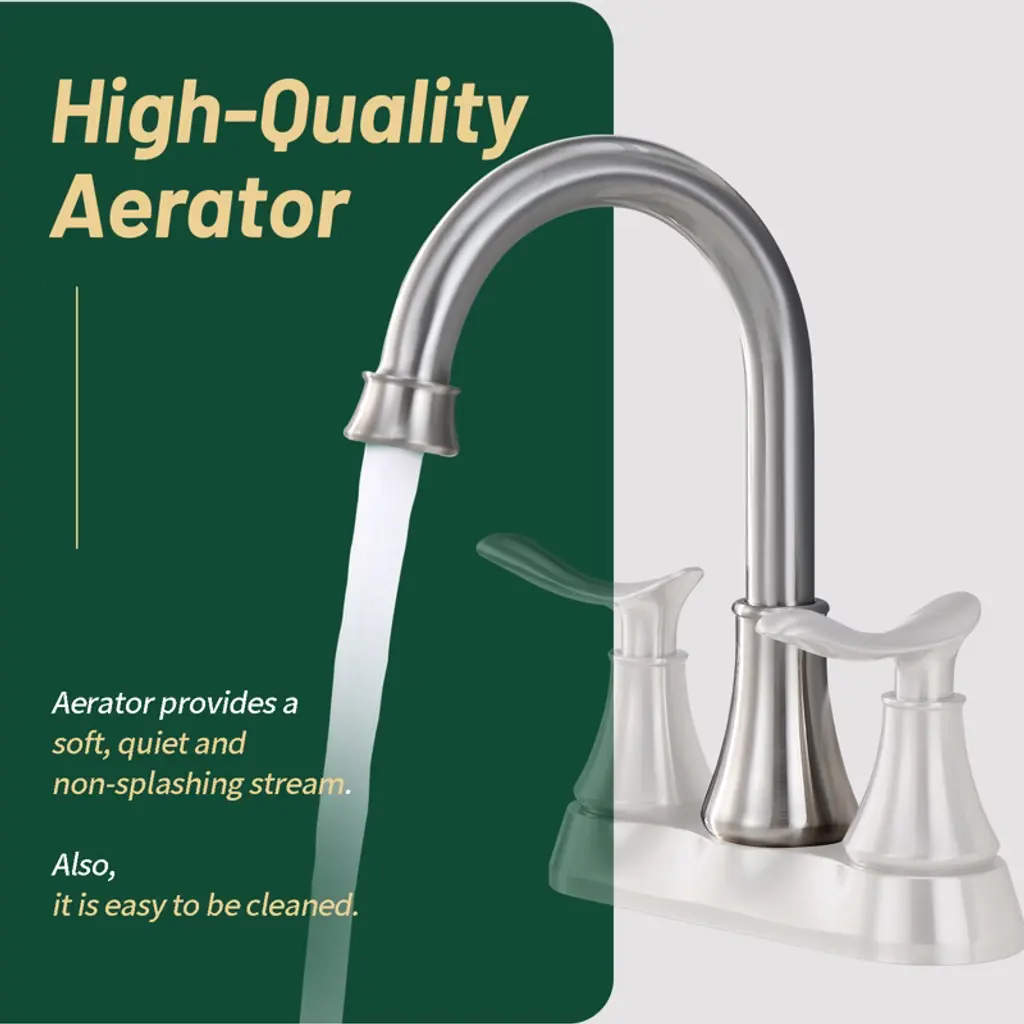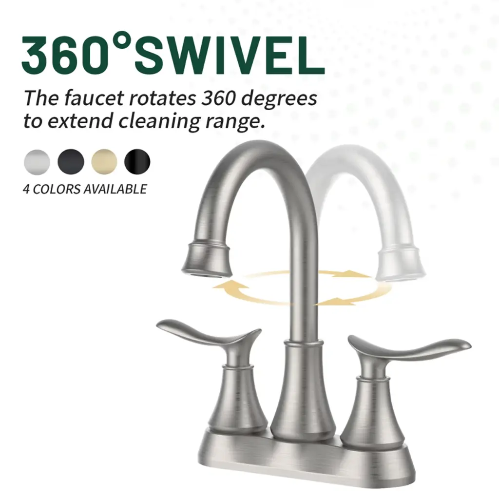 Our bathroom faucets are made of high quality materials that are durable and corrosion resistant. The professionally tested ceramic cartridge ensures that the faucet will not leak or drip and is durable. Perfect for new house renovation, old house renovation, high-end villas, high-end apartments, luxury hotels, elite and middle class. HIGH QUALITY MATERIALS & DESIGN : Exquisite bathroom sink faucet is rust and corrosion resistant to ensure durability. Dual Handle Metal Handle; The dual handle handle bathroom faucet is designed for precise control of water volume and water temperature, and the advanced ceramic cartridge prevents leaks and drips. WATER CONSERVATION: Imported ABS aerator of 2-hole mount 4-inch center bathroom sink faucet enhances the dense foaming effect, the water flow is dense and soft without splashing, which improves water conservation efficiency. Suitable for rental houses, new apartments, bachelor pads, motels, travel trailers and homes. EASY INSTALLATION: The bathroom faucet is designed to help you save money by following the instructions and installing it in less than 30 minutes without a plumber. Everything you need is included in the box (including the pop-up drain and stainless steel braided inlet hose). 360° Swivel: The 360-degree swivel nozzle provides a full range of cleaning for your bathroom sink.