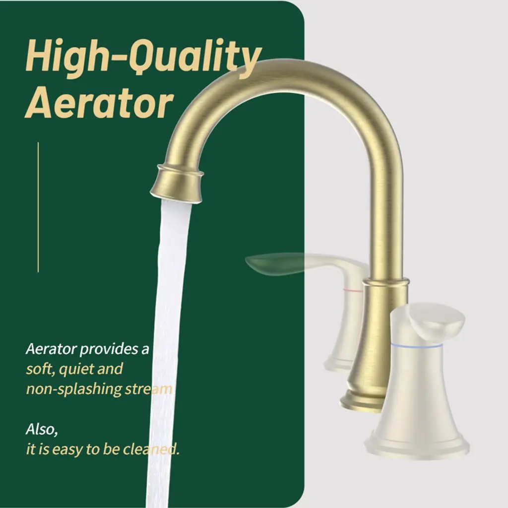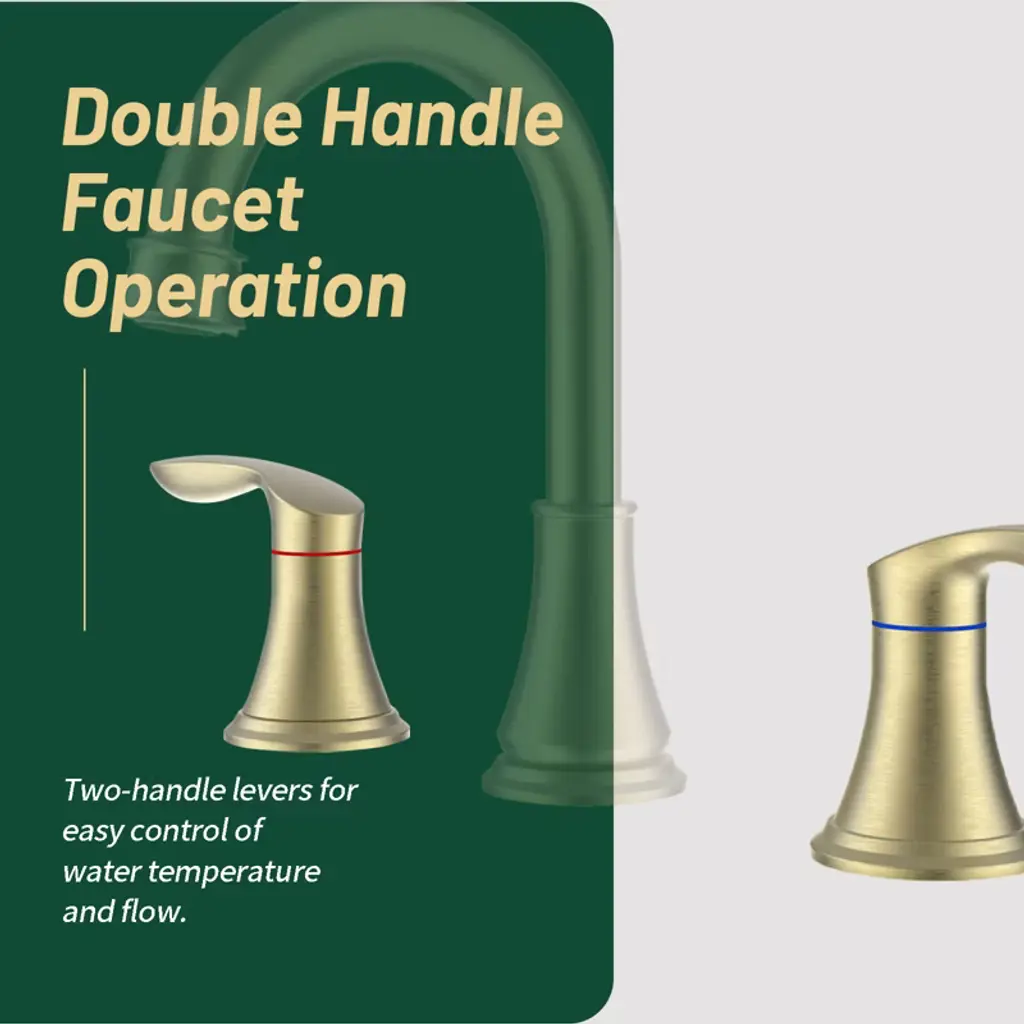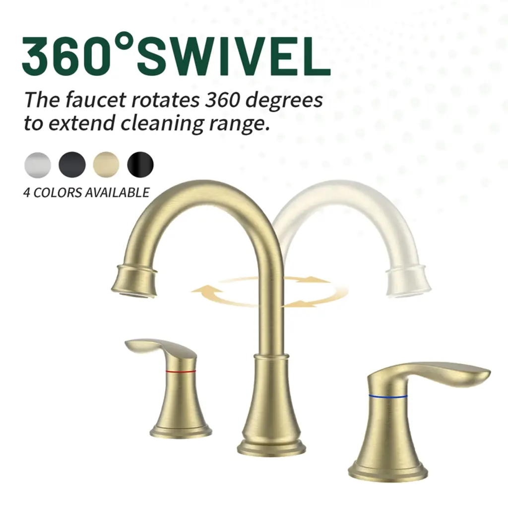 Cobbe 2-handle 8 Inch Widespread Bathroom Sink Faucet Brushed Gold Lavatory Faucet 3 Hole 360° Swivel Spout Vanity Sink Basin Faucets