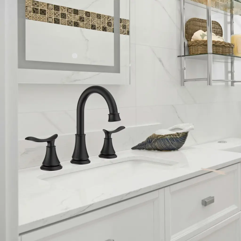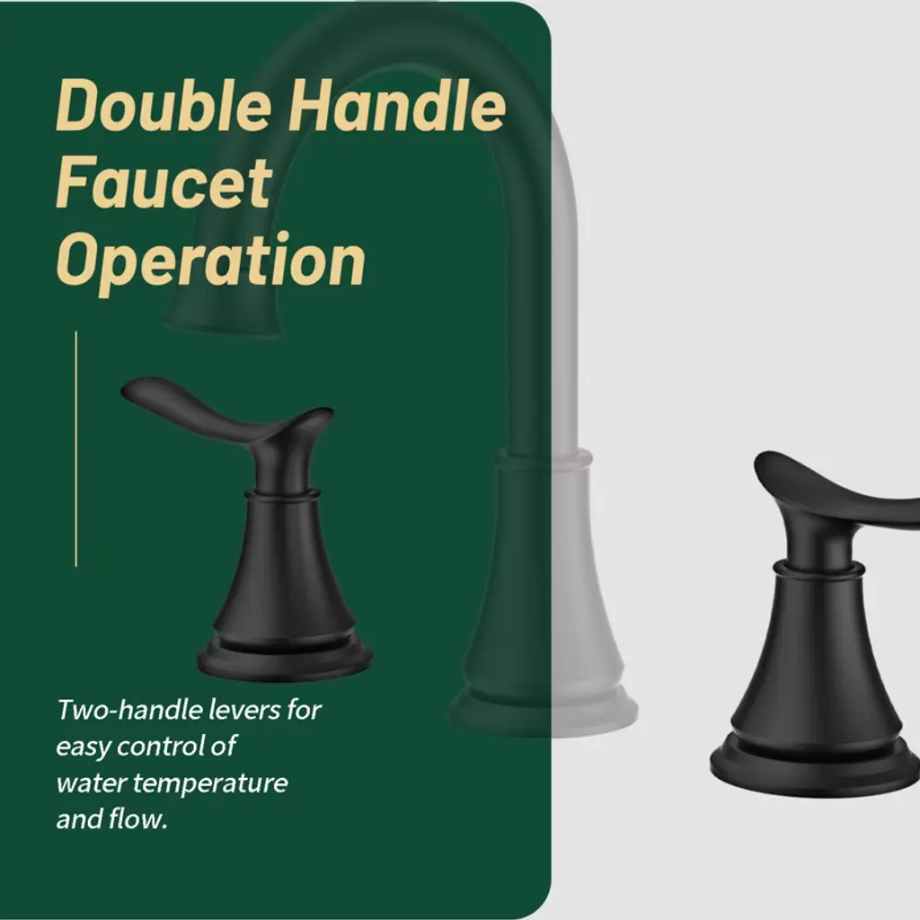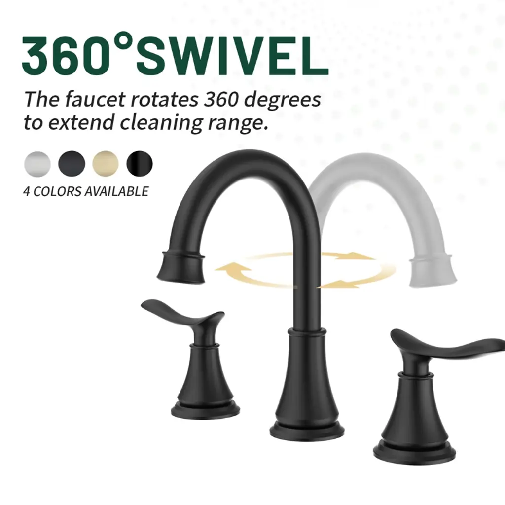 Cobbe 2-handle 8 Inch Widespread Bathroom Sink Faucet Matte Black Lavatory Faucet 3 Hole 360° Swivel Spout Vanity Sink Basin Faucets