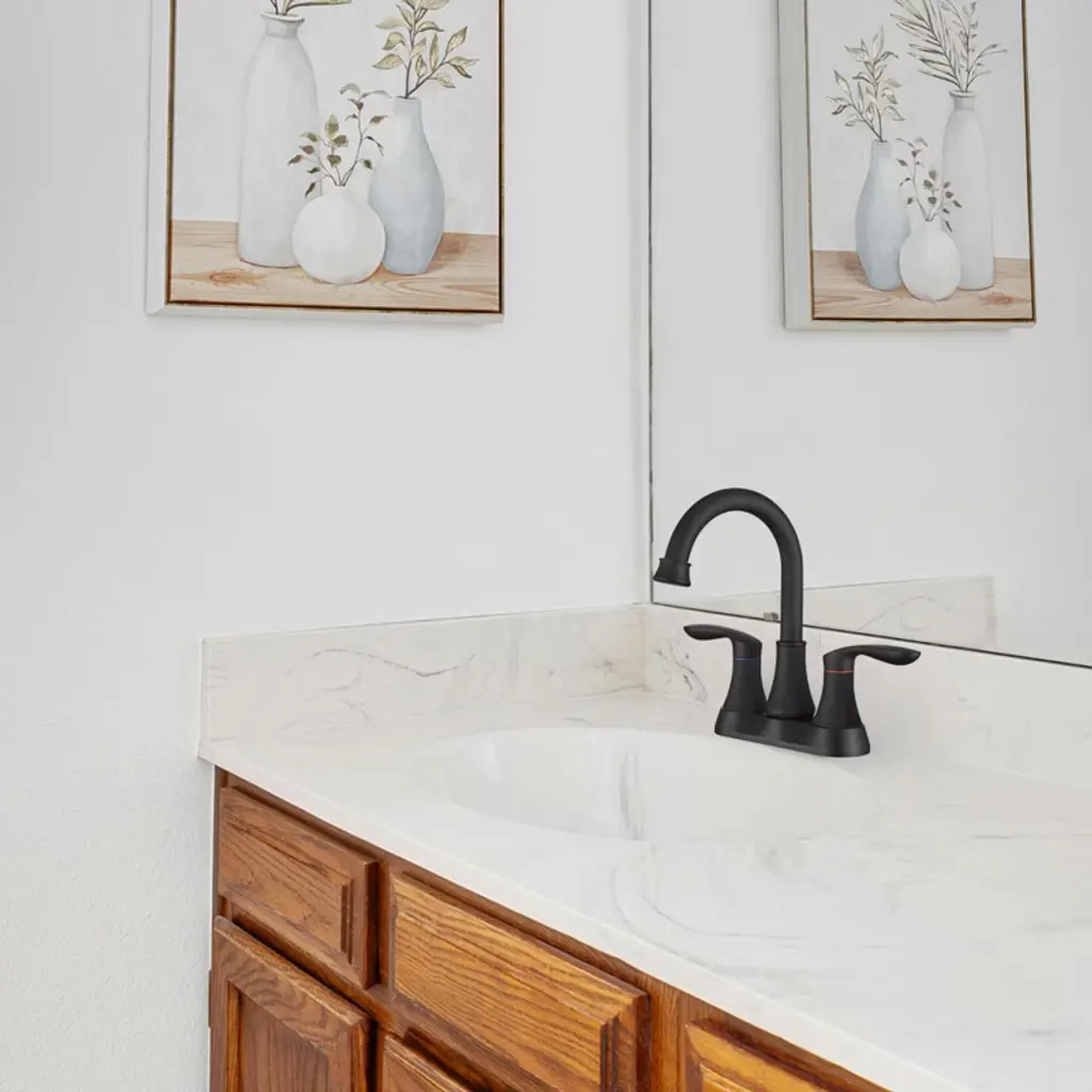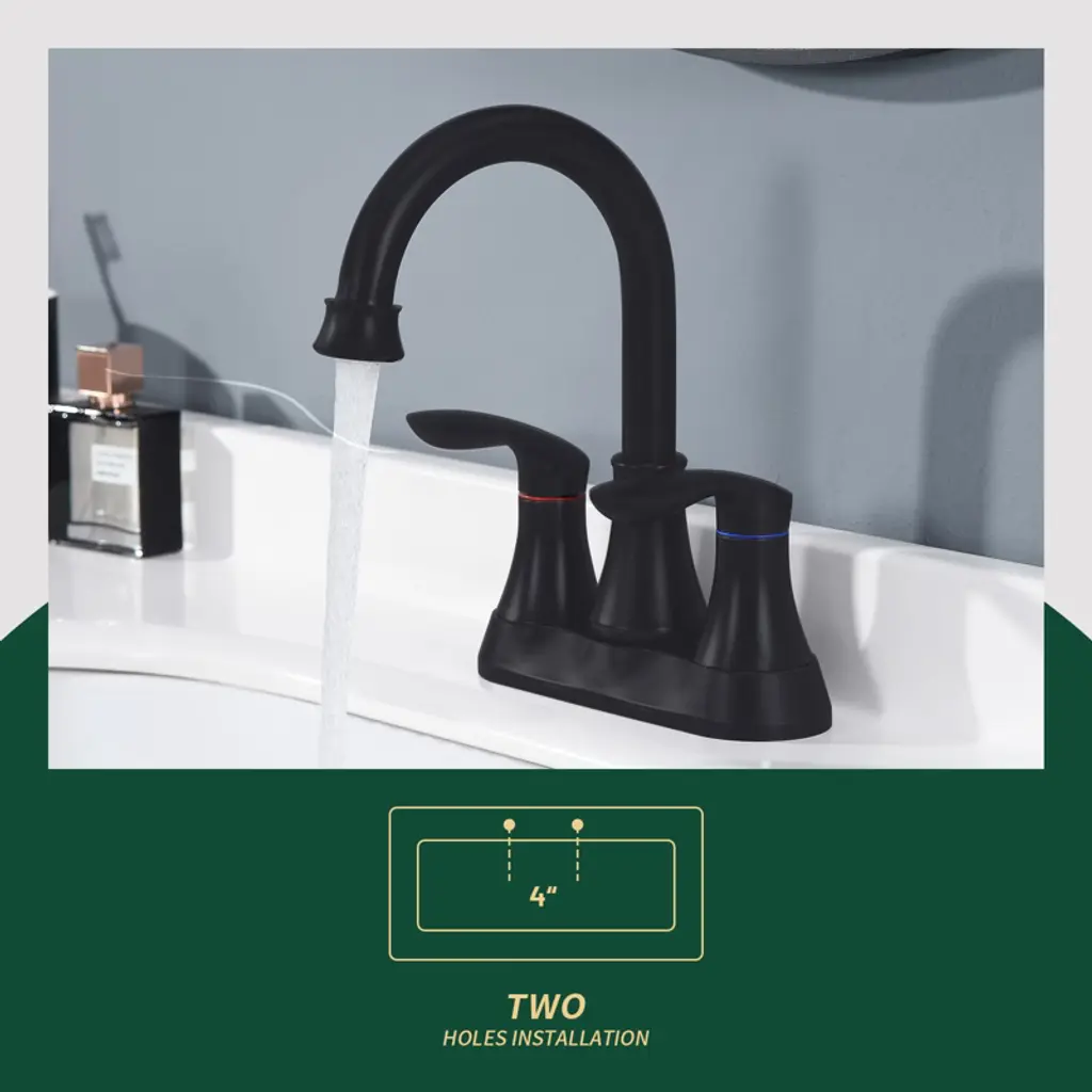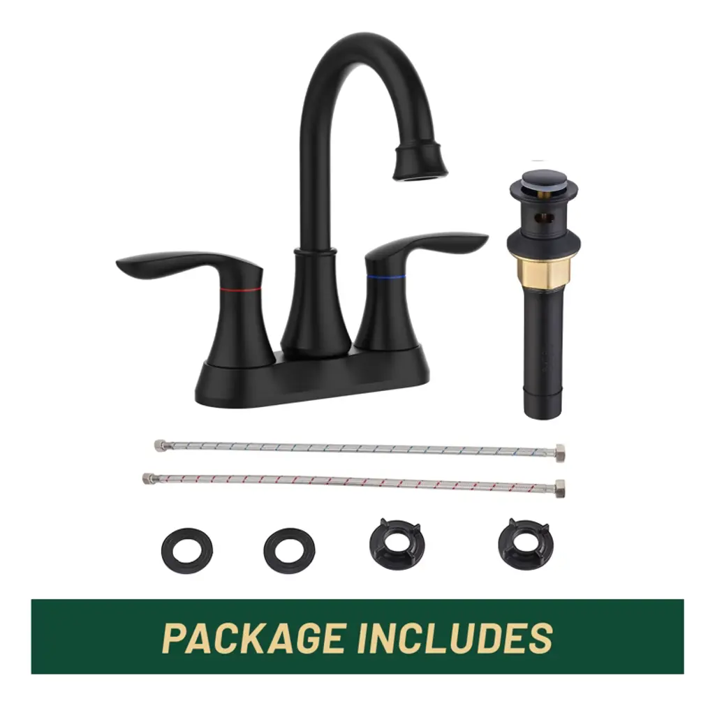 Cobbe Bathroom Faucet Matte Black With Pop-up Drain & Supply Hoses 2-handle 360 Degree High Arc Swivel Spout Centerset 4 Inch Vanity Sink Faucet