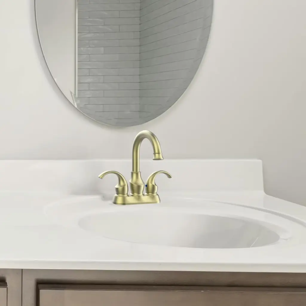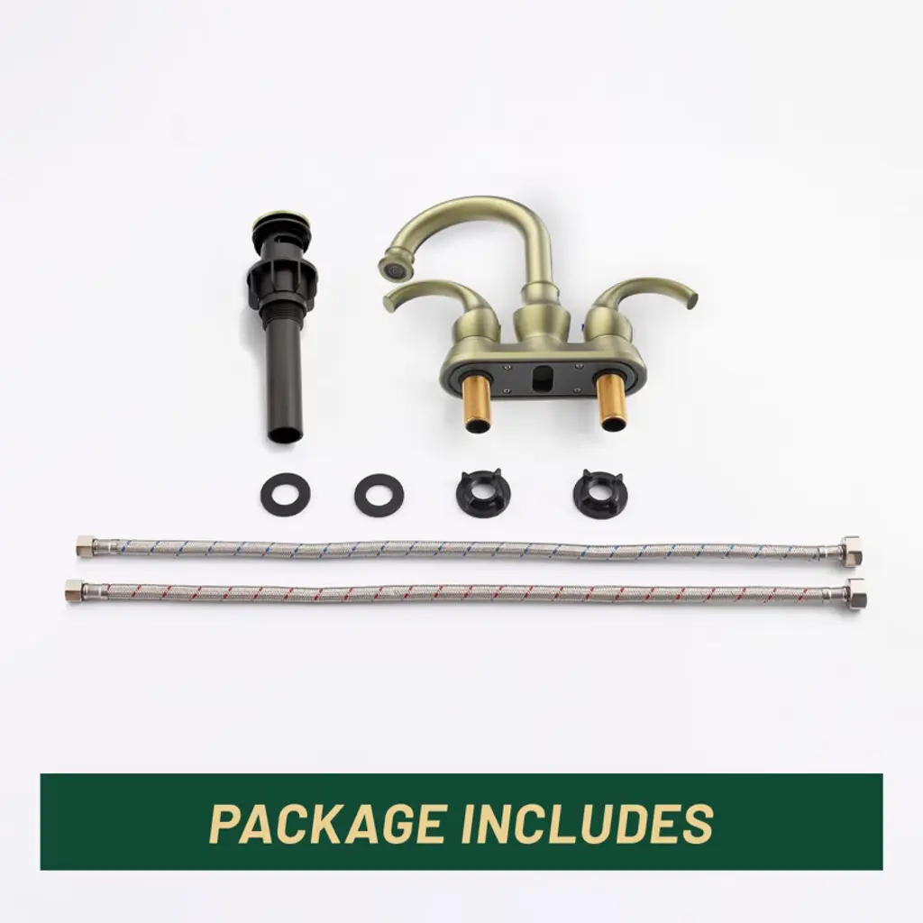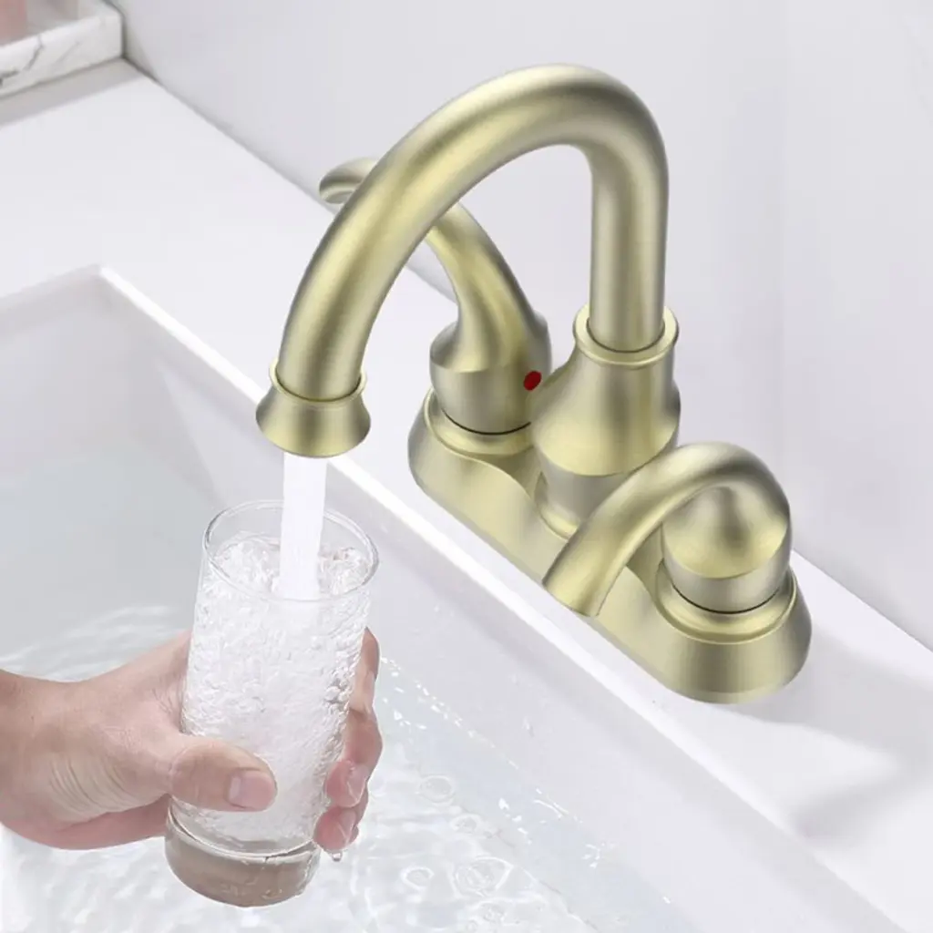Cobbe Brushed Gold Bathroom Faucet 2-handle With 360 Degree Rotating Spout, 4-inch Centerset Vanity Sink With Pop-up Drain And Supply Hoses