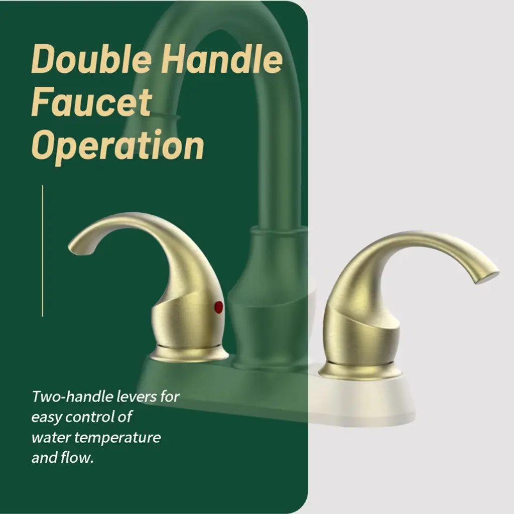 Our bathroom faucets are made of high quality materials that are durable and corrosion resistant. The professionally tested ceramic cartridge ensures that the faucet will not leak or drip and is durable. Perfect for new house renovation, old house renovation, high-end villas, high-end apartments, luxury hotels, elite and middle class. HIGH QUALITY MATERIALS & DESIGN : Exquisite bathroom sink faucet is rust and corrosion resistant to ensure durability. DUAL HANDLE: The dual handle handle bathroom faucet is designed for precise control of water volume and water temperature, and the advanced ceramic cartridge prevents leaks and drips. WATER CONSERVATION: Imported ABS aerator of 2-hole mount 4-inch center bathroom sink faucet enhances the dense foaming effect, the water flow is dense and soft without splashing, which improves water conservation efficiency. Suitable for rental houses, new apartments, bachelor pads, motels, travel trailers and homes. EASY INSTALLATION: The bathroom faucet is designed to help you save money by following the instructions and installing it in less than 30 minutes without a plumber. Everything you need is included in the box (including the pop-up drain and hose). 360° SWIVEL: The 360-degree swivel nozzle provides a full range of cleaning for your bathroom sink.