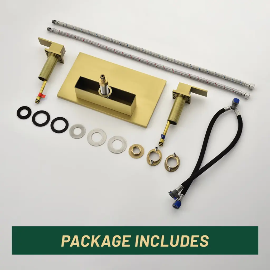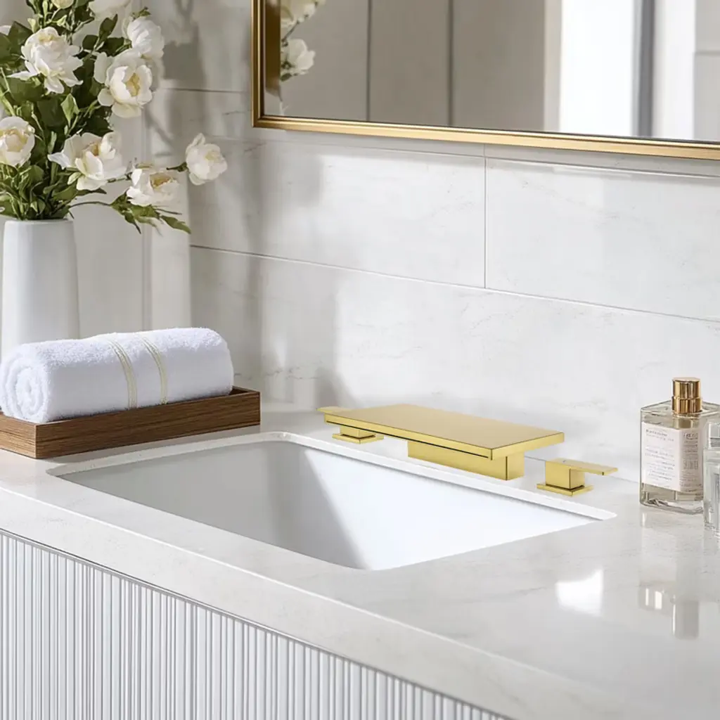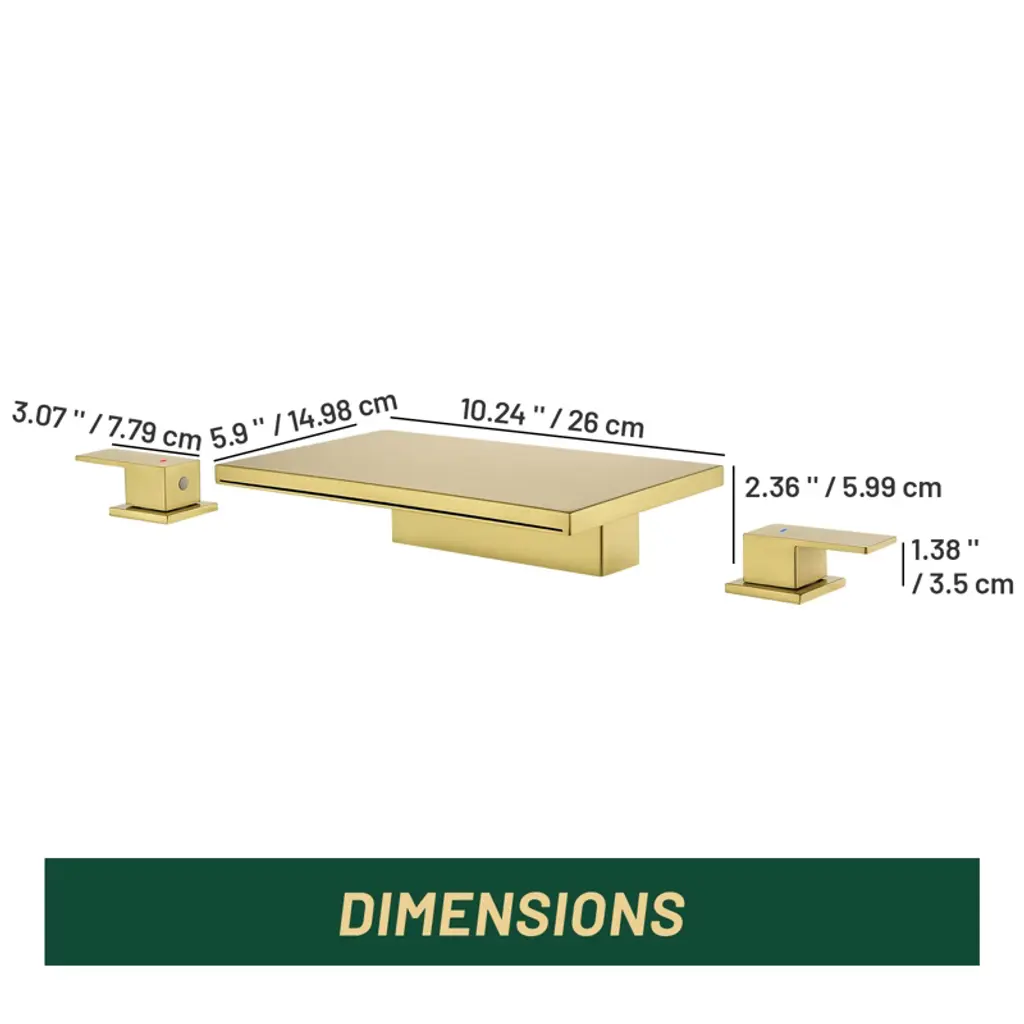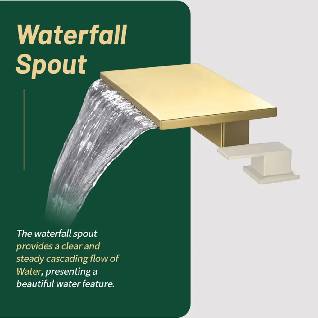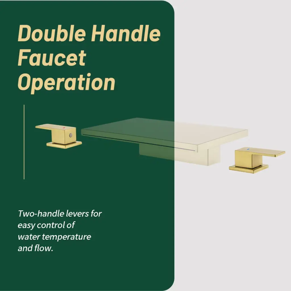 Cobbe Brushed Gold Widespread Waterfall Bathroom Sink Faucet 3-hole 8-inch Modern Bathroom Faucet Two-handle Sink Faucet