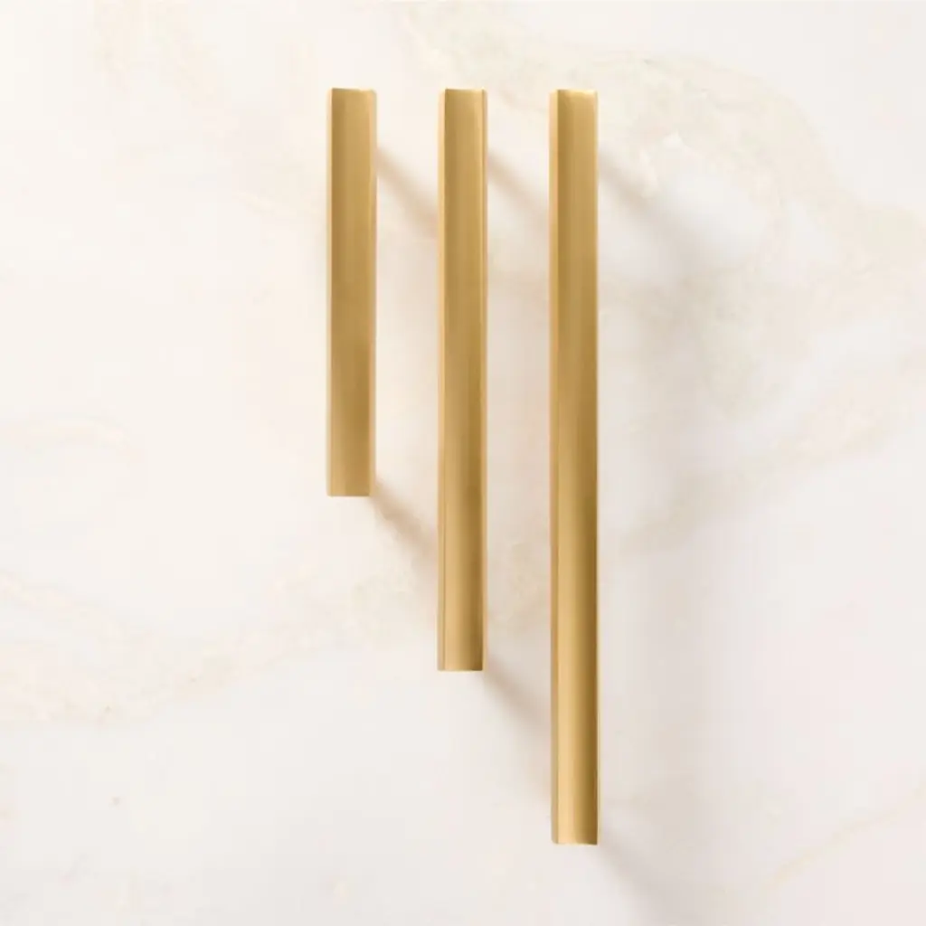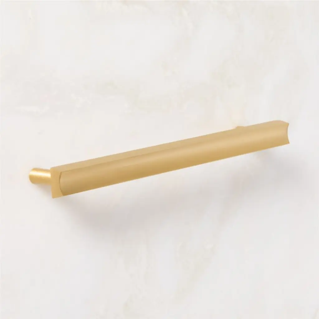 Brushed brass handle features a subtle concave design to instantly update cabinetry. Designed to coordinate with the Colton knobs. CB2 exclusive.