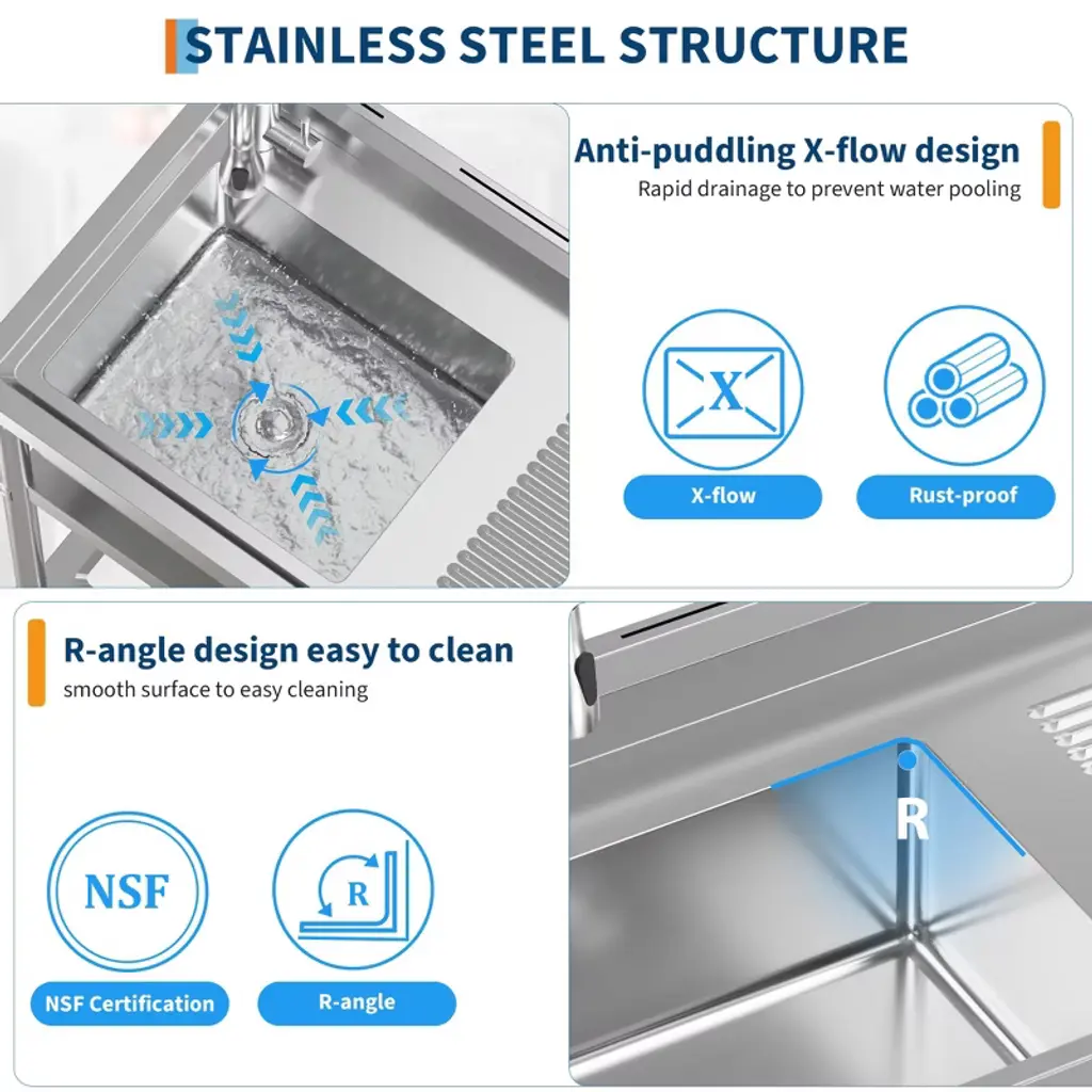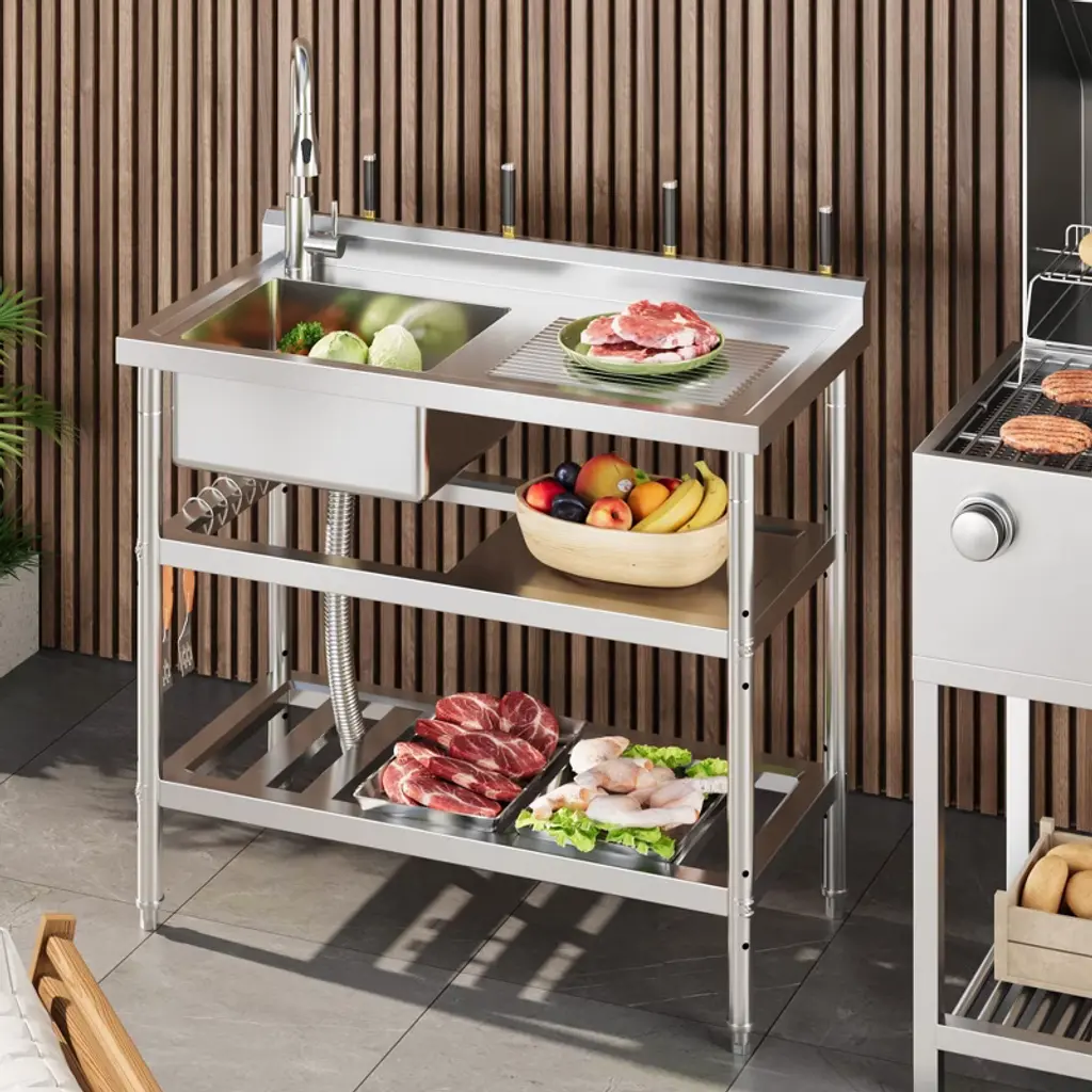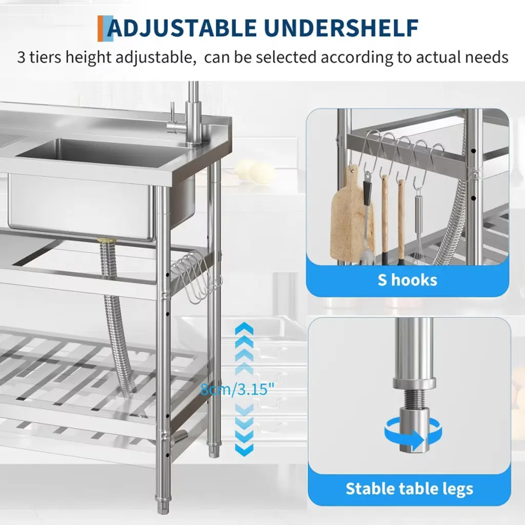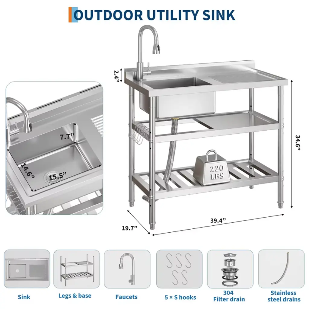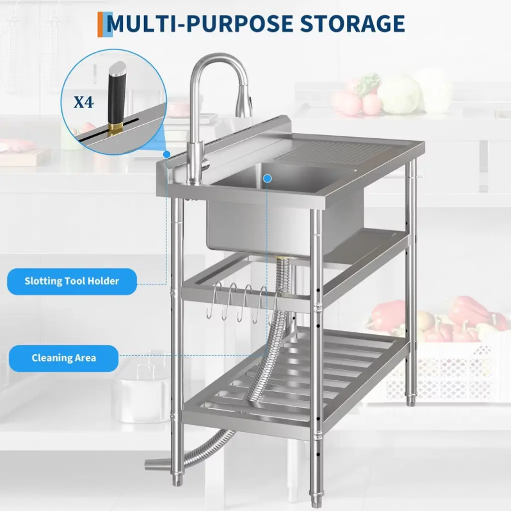 Product Details: Material: Rust-resistant stainless steel with superior corrosion and oxidation resistance Dimensions: 41.73" L x 22.44" W x 14.37" H (single bowl) Features: Spacious single bowl; built-in washboard for enhanced cleaning; multilayer sealed drainer with removable strainer basket to prevent clogs Faucet: 304 stainless steel pull-down hot and cold faucet with 360-degree swivel for flexible temperature control and extended reach Storage: Open work surface and five S-shaped hooks for organizing cleaning supplies, utensils, and tools Legs: Adjustable feet for stable placement on uneven floors Design: Freestanding with easy assembly and included toolkit Color: Stainless Steel Suitable For: Commercial kitchens, laundry rooms, garages, workshops, and outdoor utility areas Description: Boost your workspace efficiency with this freestanding commercial stainless steel utility sink, designed for durability and versatility. Measuring 41.73" by 22.44" by 14.37", the single bowl sink is constructed from rust-resistant stainless steel to withstand heavy-duty use in laundry rooms, commercial kitchens, garages, and more. Featuring a 304 stainless steel pull-down hot and cold faucet with 360-degree swivel, it provides effortless temperature control and extended reach for versatile cleaning tasks. Stability is ensured with adjustable feet that accommodate uneven floors, making the sink adaptable to various indoor and outdoor environments. The spacious single bowl includes a built-in washboard for efficient laundry and tool cleaning. The multilayer sealed drainer with a removable strainer basket traps food particles and debris to prevent clogs, ensuring smooth drainage and easy maintenance. Multiple storage options, including an open work surface and five S-shaped hooks, keep your workspace organized and clutter-free, enhancing productivity. Easy to assemble with the included toolkit, this freestanding commercial utility sink is a practical and durable solution for demanding kitchen, laundry, and workshop tasks. After-Sales Service: Customer support available for installation assistance, maintenance advice, and warranty service. What You Will Receive: Freestanding commercial stainless steel single bowl utility sink 304 stainless steel pull-down hot and cold faucet Built-in washboard Multilayer sealed drainer with removable strainer basket Open work surface Five S-shaped hooks Adjustable feet Assembly toolkit and instructions Applicable Scenarios: Ideal for commercial kitchens, laundry rooms, garages, workshops, and outdoor utility spaces requiring a durable, multifunctional sink.