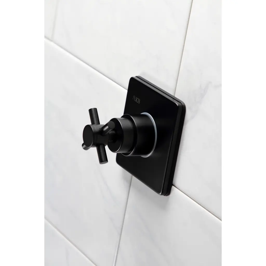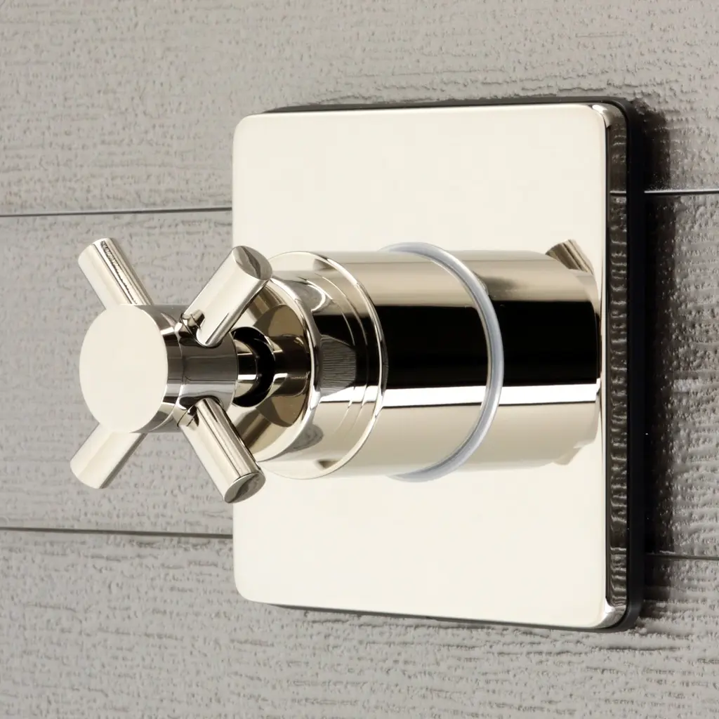 This cross handle, diverter valve and face plate help direct water to divert into three different ways, usually for the shower head, hand shower or tub spout. Each component is crafted with solid brass for durable long-term use. The diverter valve features one inlet to three outlets, to move water to its desired destination. Easy to install, the diverter is usable with hot and cold water and complies with other modern designs.Features1 inlet 3 outlets for added versatilityIn-wall installation1/2-14 NPT female inlet connection4-5/16" square shower faceplateSingle cross handle for easy operationCorrosion-resistant finishDesigned for long-lasting durability