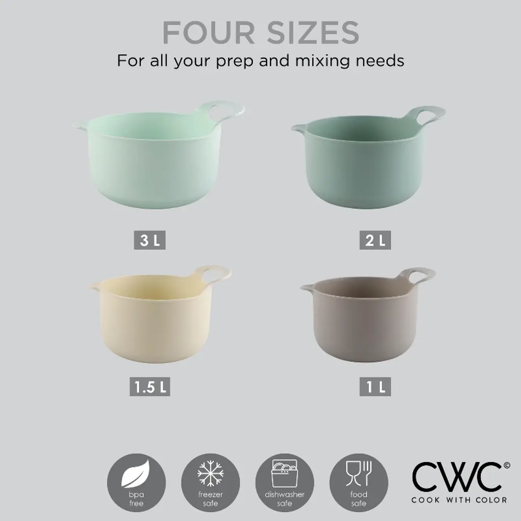 Cook with Color 4 piece mixing bowl set - non slip bowls with pour spouts and handles; easy to clean, sturdy mixing bowls. Dishwasher Safe (top rack) freezer safe, food safe and BPA free mixing bowls - your go to mixing bowl for cooking and baking.