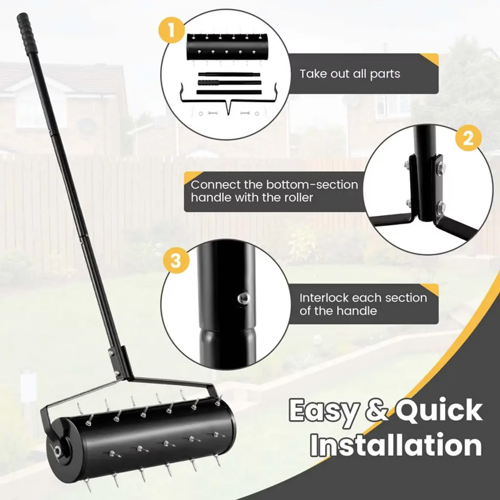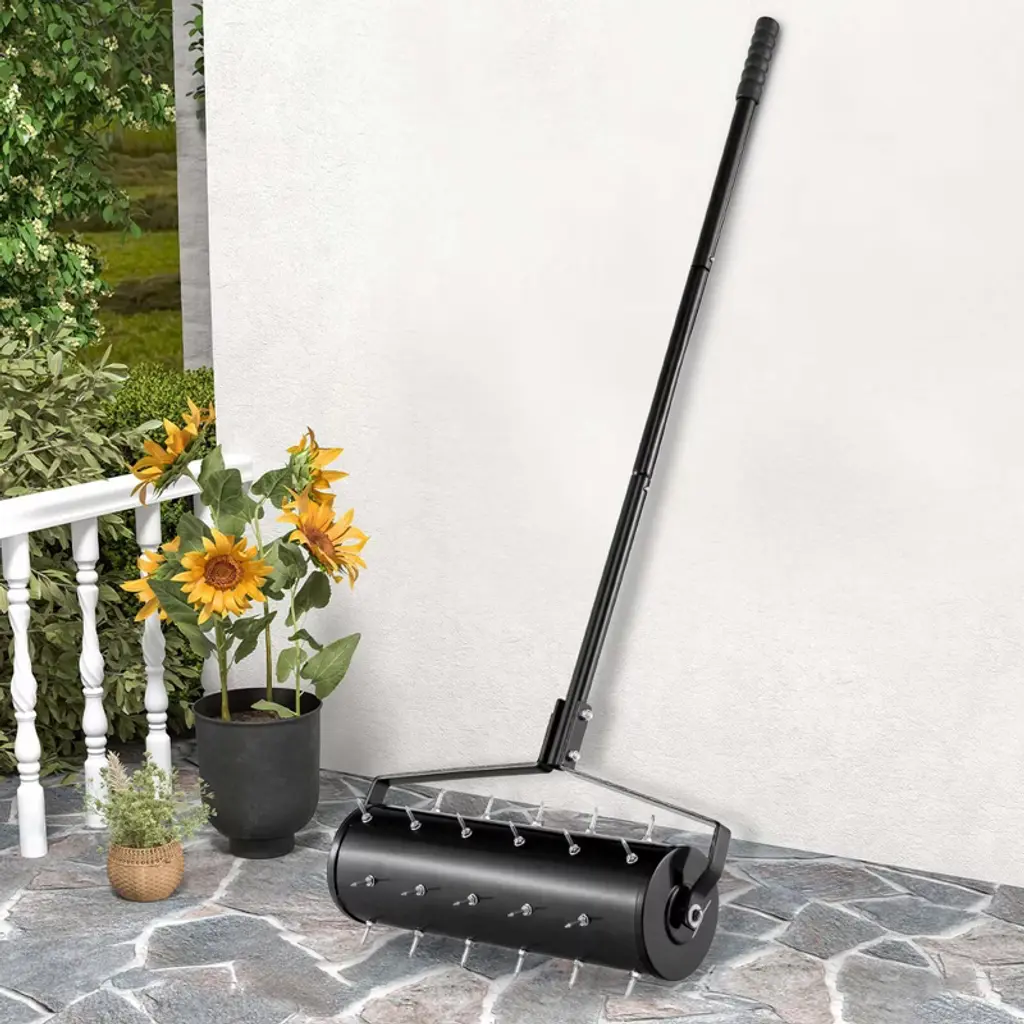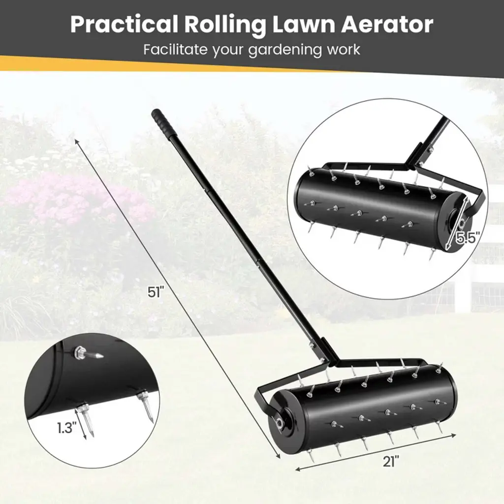 The rolling lawn aerator is a great choice for greener & lusher lawn! Before aeration, the lawn may have compact & hard soil. Equipped with 3 rows of short nail plates and 3 rows of long nail plates, the rolling lawn aerator facilitates optimal airflow and water circulation, thus resulting in a more vibrant lawn and making your plants thrive after aeration. Moreover, the drum can be filled with sand or stone, ensuring spikes go deeper. The aeration way with no sand or stone is available ad you need. With ergonomic height & other details, the rotary aerator tool will make your aeration work easier. The long and non-slip handle ensures that you can effectively aerate your lawn without painful back or waist.Crafted with painted metal frame, this lawn aerator is designed to provide you with lasting performance. Whether you have a backyard or a garden, our rolling lawn aerator is the perfect choice. Its compact size and efficient performance make it ideal for homeowners looking to maintain their lawns with ease.FeaturesThere is no more back pain with 51" reasonable height Non-slip & comfortable handle will reduce pain in hands 27 galvanized steel spikes are rustproof and not easy to deform 1.3" spikes can effectively loosen soil and promote the plant grow With 5.5L capacity to fill sand or stone, the spikes can penetrate into soil easily Solid metal construction with painted surface ensures the resistance to rust Suitable for different types of soil, such as sand, dirt and clay Detachable handle features spring button for quick connectionColor: Green/Black Material: Galvanized Steel, Metal, PP Product Size: 21" x 51" (L x H) Drum Dimension: 5.5" Spike Length: 1.3" Sand Capacity: 5.5L/6.8L Net Weight: 9.5/11 lbs Package includes: 1 x Rolling Lawn Aerator 1 x Instruction