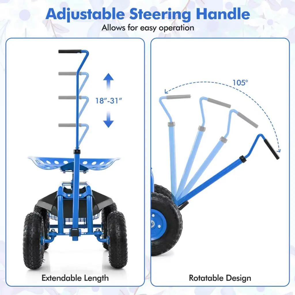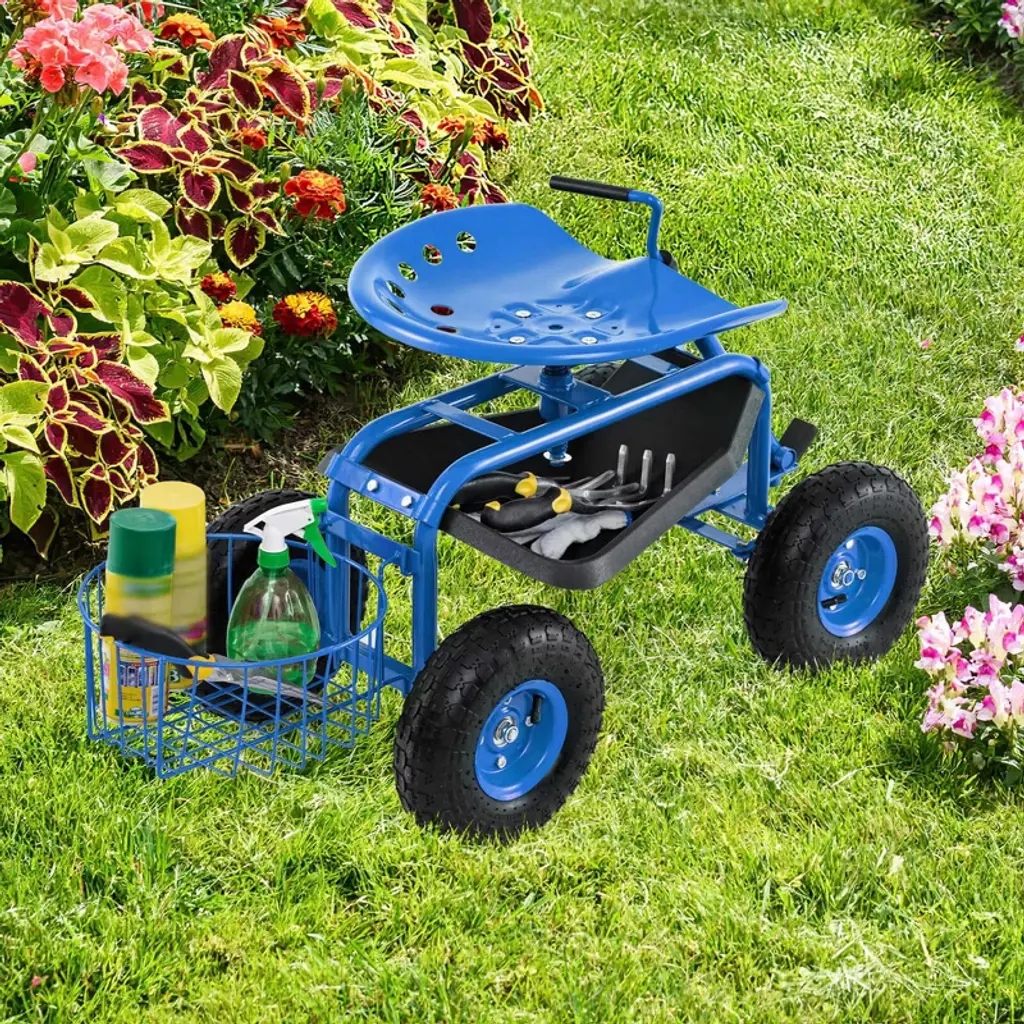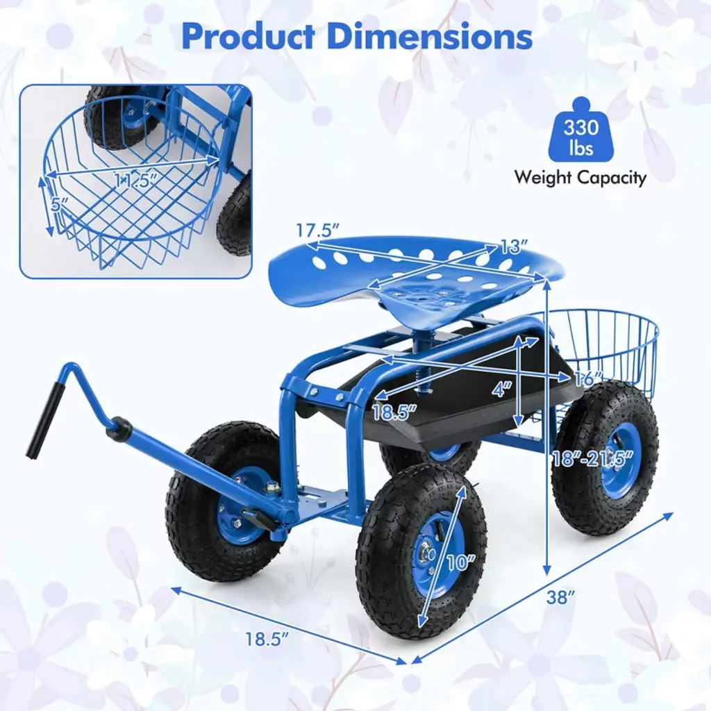 Are you looking for a useful garden rolling cart to help you take care of your plants? Our garden cart with solid steel frame is both practical and modern, which is suitable for any kinds of garden. This rolling cart comes with a large seat, which is ergonomic and comfortable. The height of seat can be adjusted and the seat can rotate at 360 degrees to meet your different needs. Featuring with a utility basket and a tool tray under the seat, it is convenient for you to do the gardening efficiently and effectively. 4 large inflated rubber tires have deep patterns can grip the ground safely to prevent tipping over. Featuring with a steeling rod with handle, the cart can swivel in any direction. FeaturesSturdy frame with large weight capacity for durability and stability Ergonomic seat can sit comfortably for long time Tool tray under the seat and mesh basket for large storage space Large weight capacity up to 330 lbs for safety Height adjustable and 360 degrees rotation seat for different needs 10 inch inflated rubber tires for easy rolling Steering rod with handle in the front of the cart for easy pulling Easy to assemble Material: Steel, Rubber, Plastic Color: Blue/Red/Green Overall Dimension: 38" x 17" x (19"-21") (L × W × H) Dimension of Basket: 11.5" x 5" (L × W ) Diameter of Wheel: 10" Net Weight: 34 lbs Max Weight Capacity: 330 lbs Package Include: 1× Garden Cart 1× Instruction
