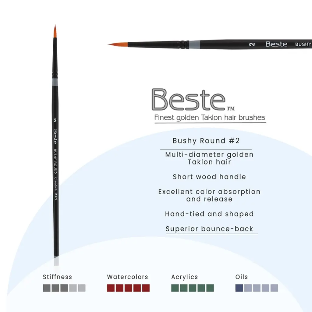 Creative Mark Beste Golden Taklon Bushy Round, #2 Artist Paint Brush, Professional Watercolor Brushes, For Acrylic Painting, Short Handle, Sharp