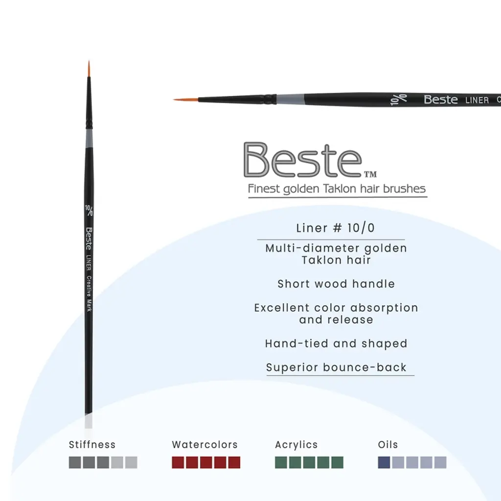 Creative Mark Beste Golden Taklon Liner, #10x0 Artist Paint Brush, Professional Watercolor Brushes, For Acrylic Painting, Short Handle, Sharp Edges,