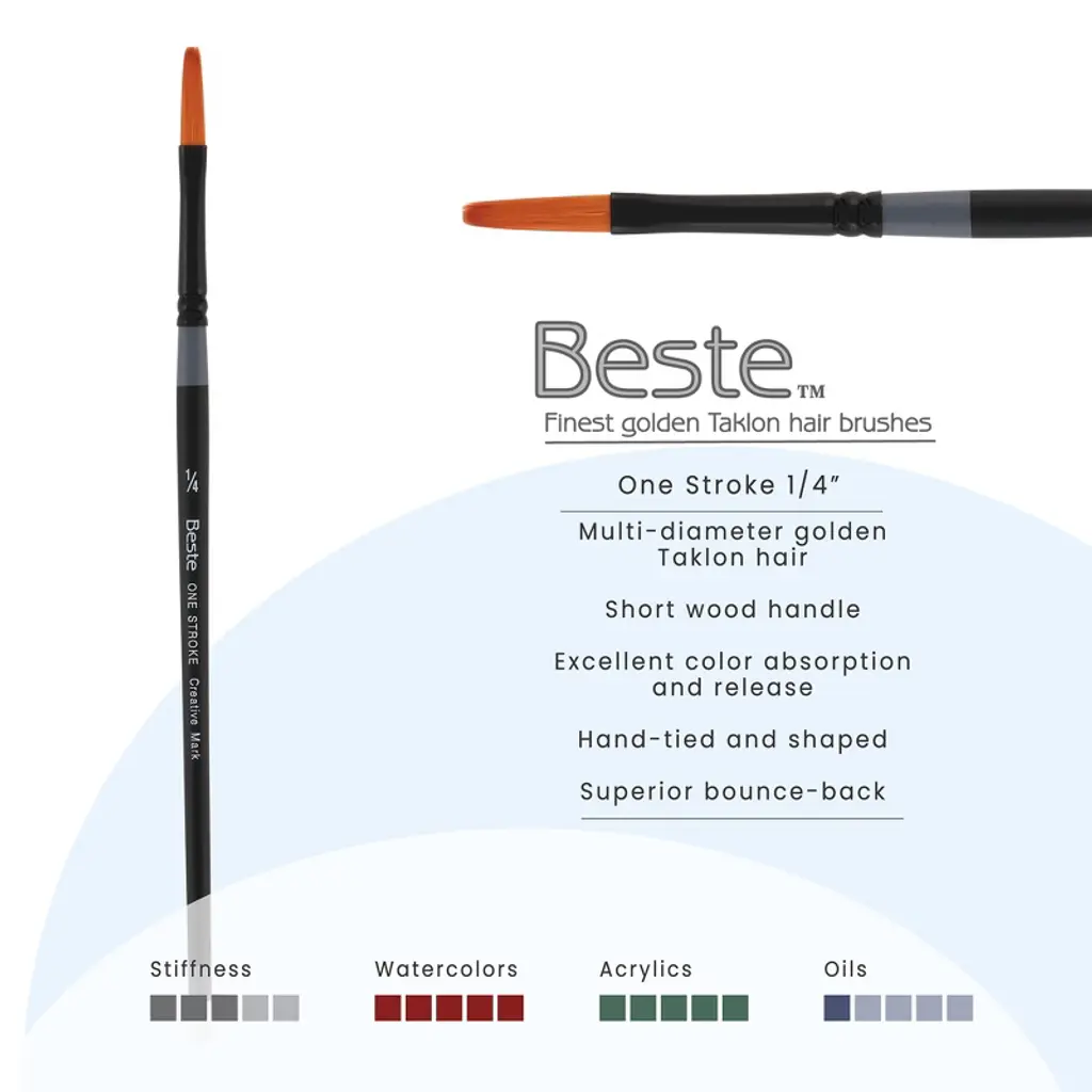 Creative Mark Beste Golden Taklon One Stroke 1/4" Artist Paint Brush, Professional Watercolor Brushes, For Acrylic Painting, Short Handle, Sharp