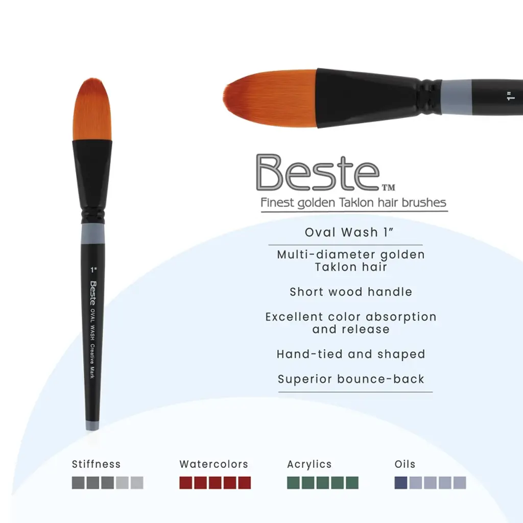 Creative Mark Beste Golden Taklon Oval Wash 1" - 2 Pack Artist Brush, Professional Watercolor Brushes, For Acrylic Painting, Short Handle, Sharp