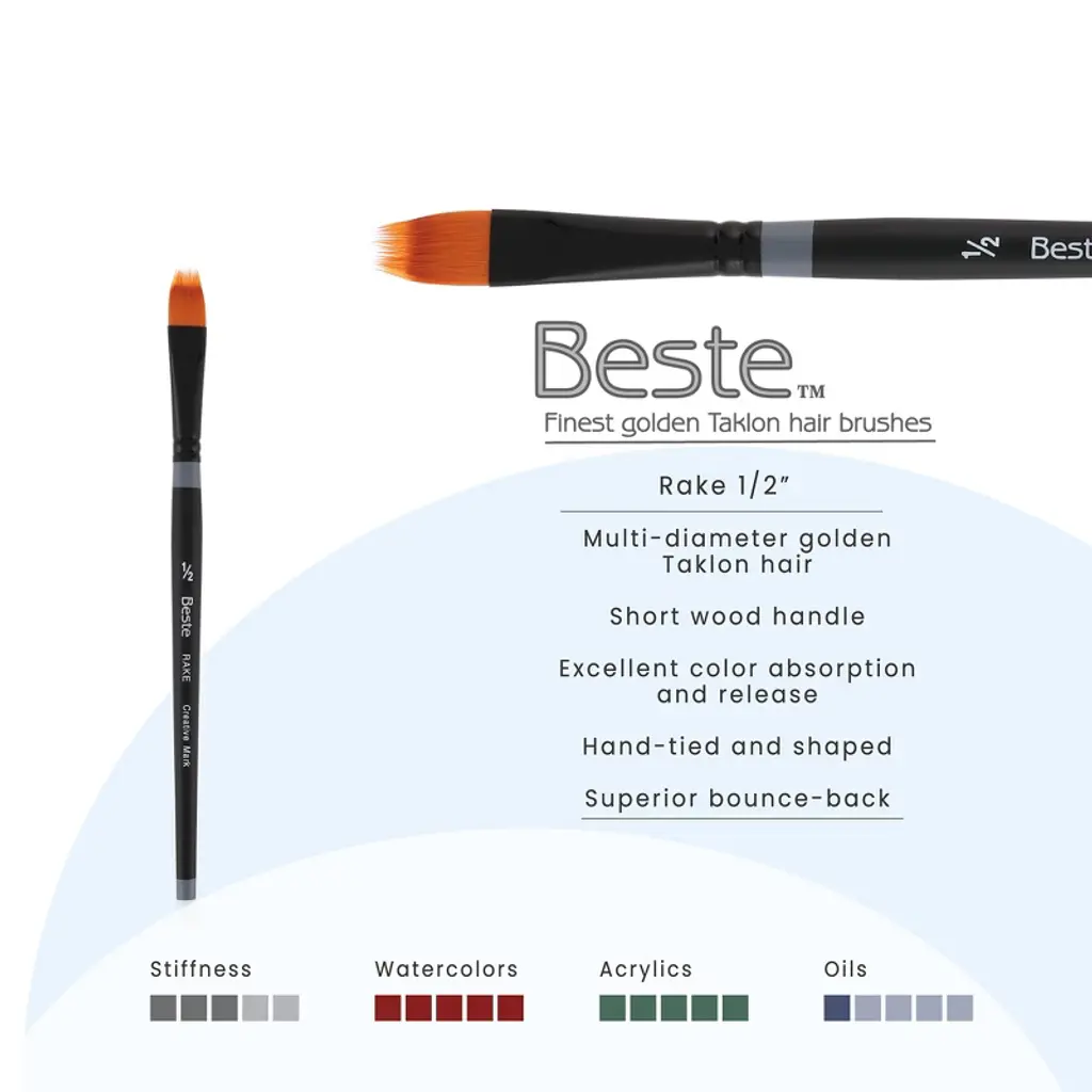 Creative Mark Beste Golden Taklon Rake 1/2" Artist Brush, Professional Watercolor Brushes, For Acrylic Painting, Short Handle, Sharp Edges, Hand-tied