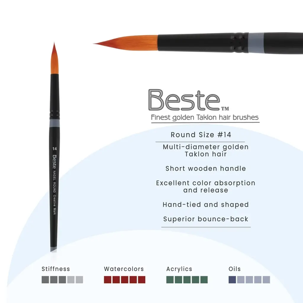 Creative Mark Beste Golden Taklon Round #14 Artist Brush, Professional Watercolor Brushes, For Acrylic Painting, Short Handle, Sharp Edges, Hand-tied