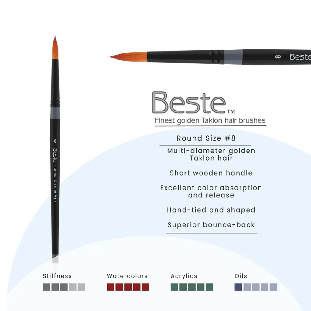 Creative Mark Beste Golden Taklon Round #8 - 2 Pack Artist Brush, Professional Watercolor Brushes, For Acrylic Painting, Short Handle, Sharp Edges,