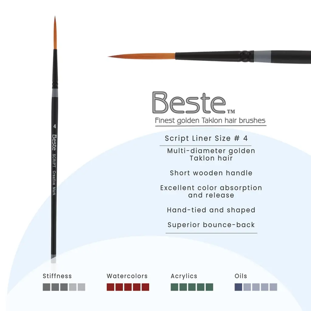 Creative Mark Beste Golden Taklon Script Liner, #4 - 2 Pack Artist Paint Brush, Professional Watercolor Brushes, For Acrylic Painting, Short Handle,