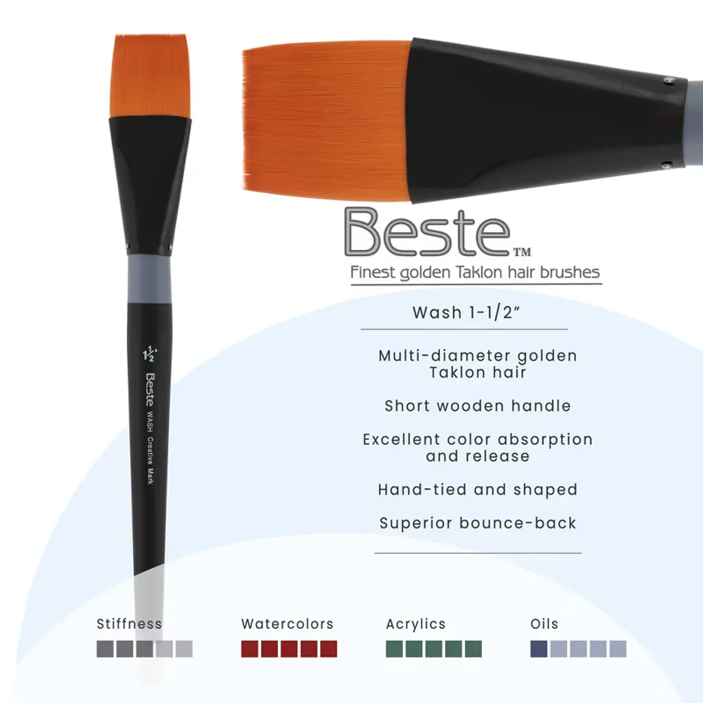 Creative Mark Beste Golden Taklon Wash, 1-1/2" Artist Paint Brush, Professional Watercolor Brushes, For Acrylic Painting, Short Handle, Sharp Edges,