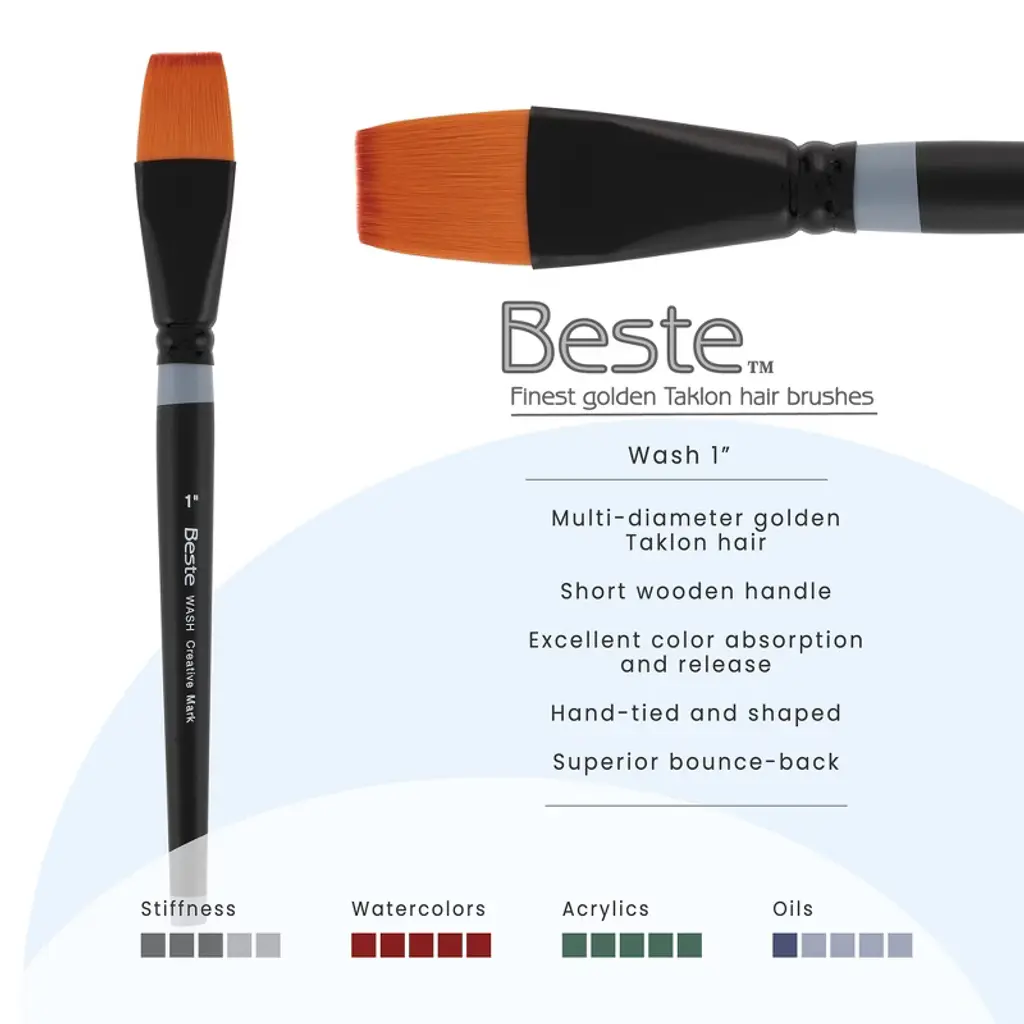 Creative Mark Beste Golden Taklon Wash 1" - 2 Pack Artist Brush, Professional Watercolor Brushes, For Acrylic Painting, Short Handle, Sharp Edges,