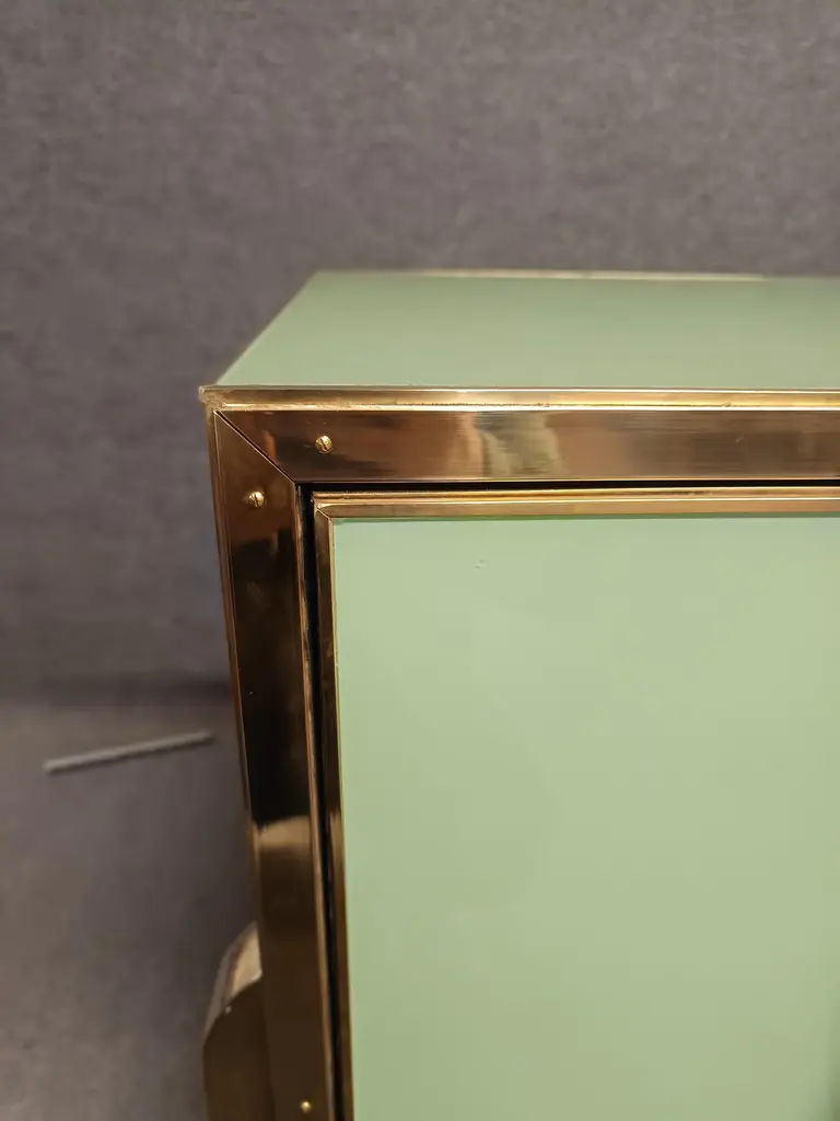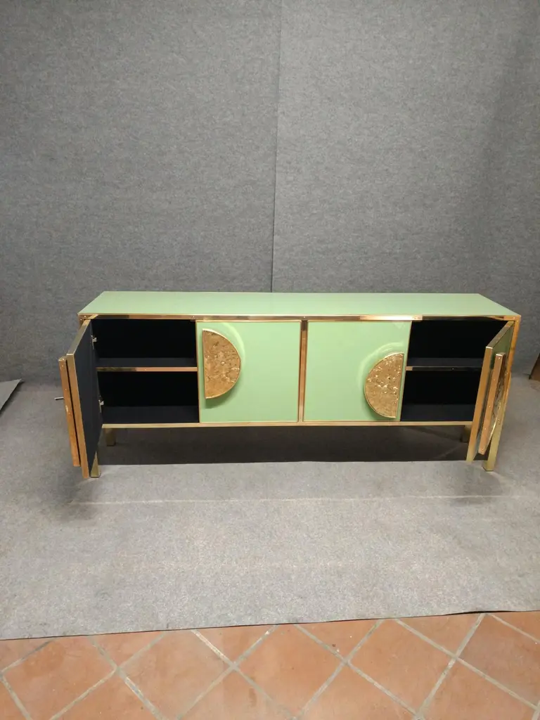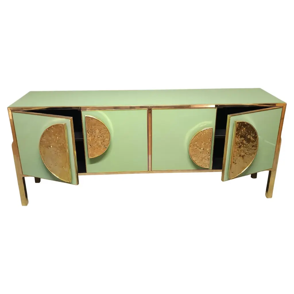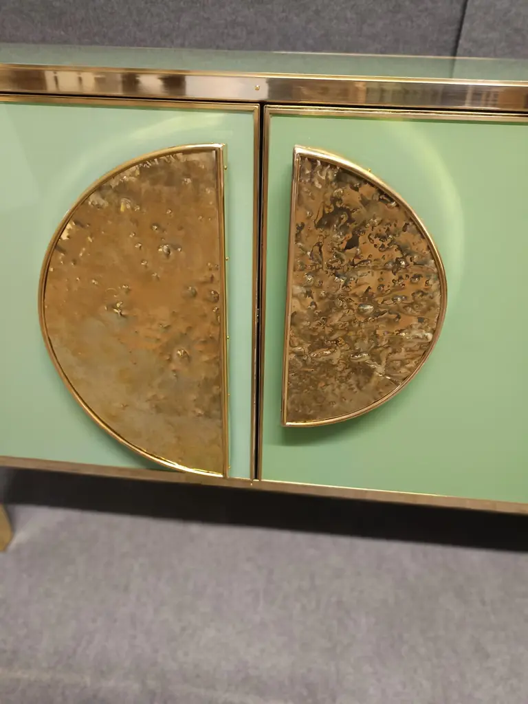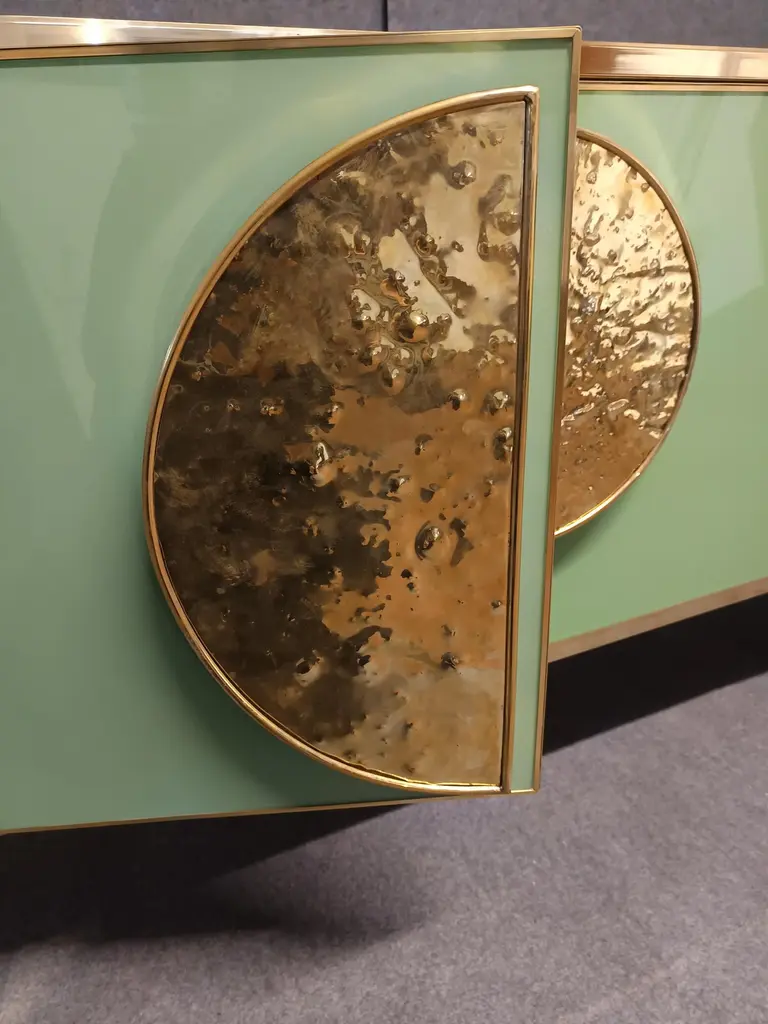 Green Murano glass four-door sideboard with brass fittings and handles This exquisite sideboard represents the pinnacle of Italian craftsmanship, thanks to its mix of birch wood, brass fittings and beautiful green Murano glass. Handcrafted with meticulous attention to detail, this piece features hand-painted and hand-carved elements, creating a truly unique work of art. The four doors are embellished with elegant green Murano glass handles, adding a touch of luxury and sophistication. Bevelled glass surfaces enhance the visual appeal of the sideboard, while the innovative geometric design and feet lend a modern aesthetic. This custom-made masterpiece, produced in Italy within 6-7 weeks, serves as both a functional storage solution and an eye-catching focal point for any interior. The harmonious combination of materials and techniques results in a piece that is sure to intrigue and inspire.