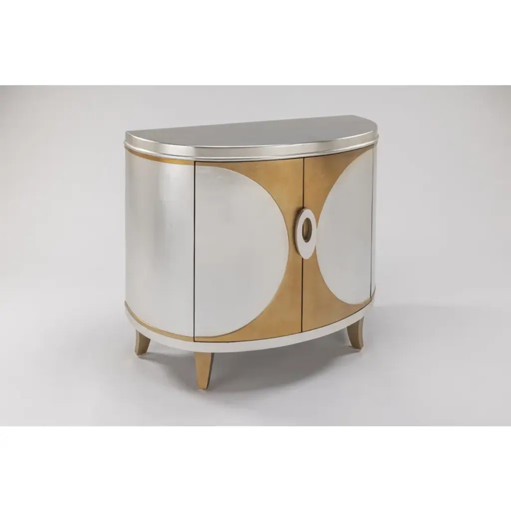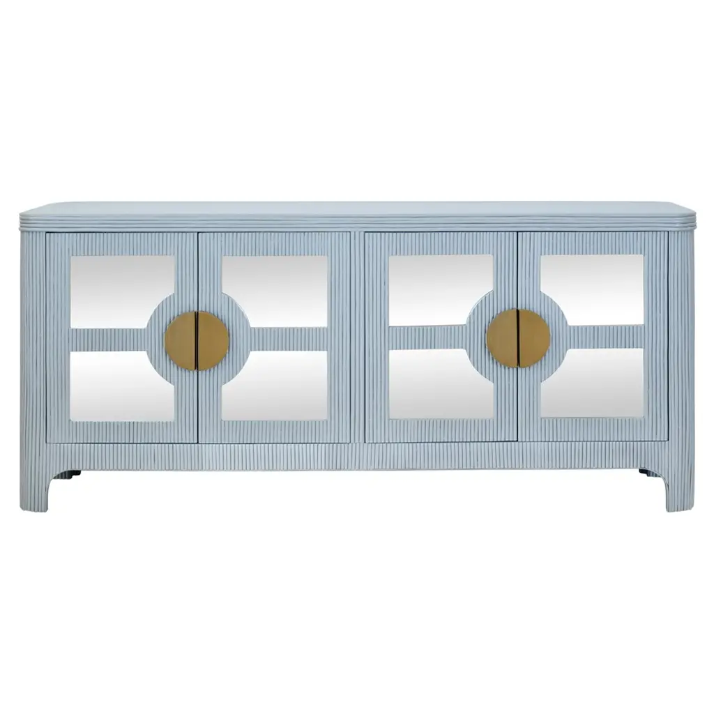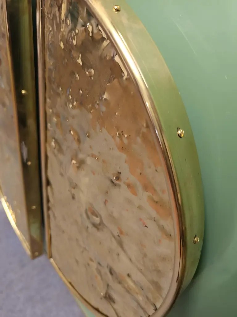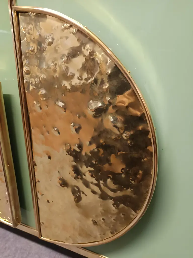 Green Murano glass four-door sideboard with brass fittings and handles This exquisite sideboard represents the pinnacle of Italian craftsmanship, thanks to its mix of birch wood, brass fittings and beautiful green Murano glass. Handcrafted with meticulous attention to detail, this piece features hand-painted and hand-carved elements, creating a truly unique work of art. The four doors are embellished with elegant green Murano glass handles, adding a touch of luxury and sophistication. Bevelled glass surfaces enhance the visual appeal of the sideboard, while the innovative geometric design and feet lend a modern aesthetic. This custom-made masterpiece, produced in Italy within 6-7 weeks, serves as both a functional storage solution and an eye-catching focal point for any interior. The harmonious combination of materials and techniques results in a piece that is sure to intrigue and inspire.