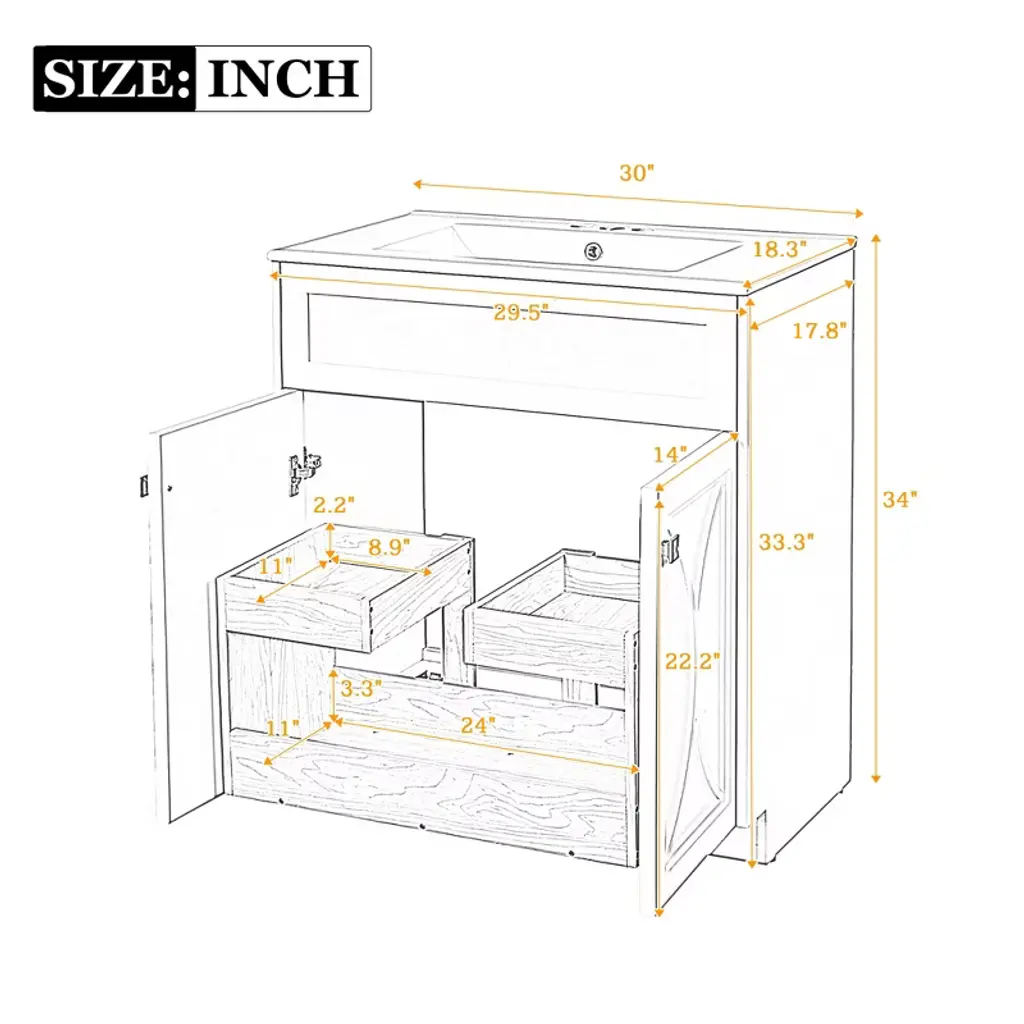 This 30-inch modern style bathroom cabinet, with elegant white as the main color, adds a touch of calmness and fashion to your bathroom space. The cabinet body is made of high-quality environmentally friendly materials, with smooth and wear-resistant surface treatment, which is not only durable but also has a high-end texture.In terms of design, the bathroom cabinet is equipped storage cabinets, providing ample storage space, easily organizing daily items such as toiletries and towels, so that the bathroom bids farewell to clutter and takes on a new look. The rack slides are smooth and silent, open and close freely, and the details are full of ingenuity.The countertop is made of high-quality waterproof material, which is easy to clean, moisture-proof and mildew-proof, suitable for the bathroom environment. The simple lines and modern style handle design perfectly match the contemporary home aesthetics. Whether it is a small bathroom or a spacious master bathroom, it can be easily integrated and become the finishing touch of the space.Whether you pursue practical functions or focus on aesthetic design, this navy blue bathroom cabinet can meet your needs and create a neat, comfortable and stylish bathroom space for you.